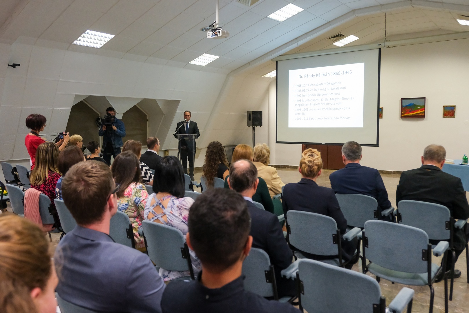 A megjelenteket Becsei László főigazgató főorvos köszöntötte, aki elmondta: Pándy Kálmán 1868. október 14-én született Ókígyóson, majd Budapesten hunyt el, 1945-ben. 1898-tól 1905-ig volt a gyulai kórház elmeosztályának vezetője. Széles látókörű, céltudatos, határozott ember volt.