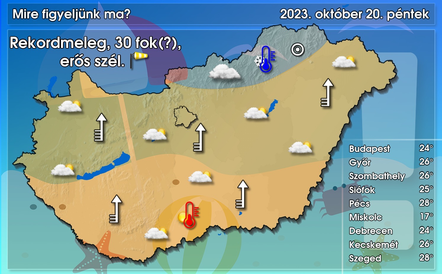 Példa nélküli nap elé nézünk, ugyanis amellett, hogy a maximumhőmérséklet jó eséllyel megdől (26,9 fok, Adony), még a 30 fokot is elérhetjük, ami egyáltalán nem szokványos október második felében (30 fok feletti hőmérséklet a mérések kezdete óta október 6-a után nem fordult még elő). Mindemellett tovább erősödik a délies szél, amely főként az Észak-Dunántúlon viharossá is fokozódik. Északkeleten is elkezd szakadozni a felhőzet, és általában közepesen vagy erősen felhős idő valószínű számottevő csapadék nélkül, 20 fok feletti maximummal. A szélvédett részeken (elsősorban az Északi-középhegység északi oldalán) jobban beragadhat a hőmérséklet, de ott is átlag környékén alakul.