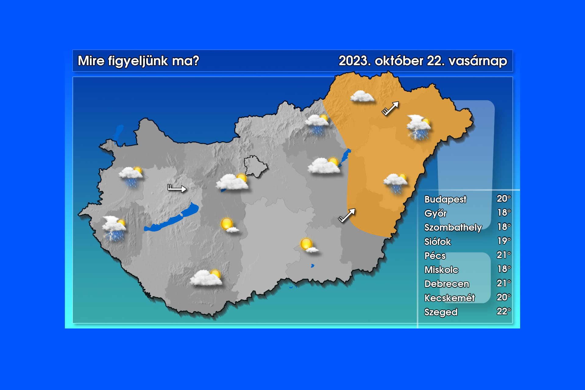 Jó reggelt! Ma alapvetően gomolyfelhős, napos idő várható, csak északon, északkeleten lehet kezdetben több a felhő. Helyenként, nagyobb eséllyel nyugaton, illetve keleten, északkelen kell záporok kialakulására számítani, sőt néhol még az ég is megdörrenhet. A nyugati, délnyugati szél élénk, a sárgával jelölt területen erős lehet. A hőmérséklet továbbra is a sokévi átlag felett alakul, délkeleten lesz a legmelegebb.