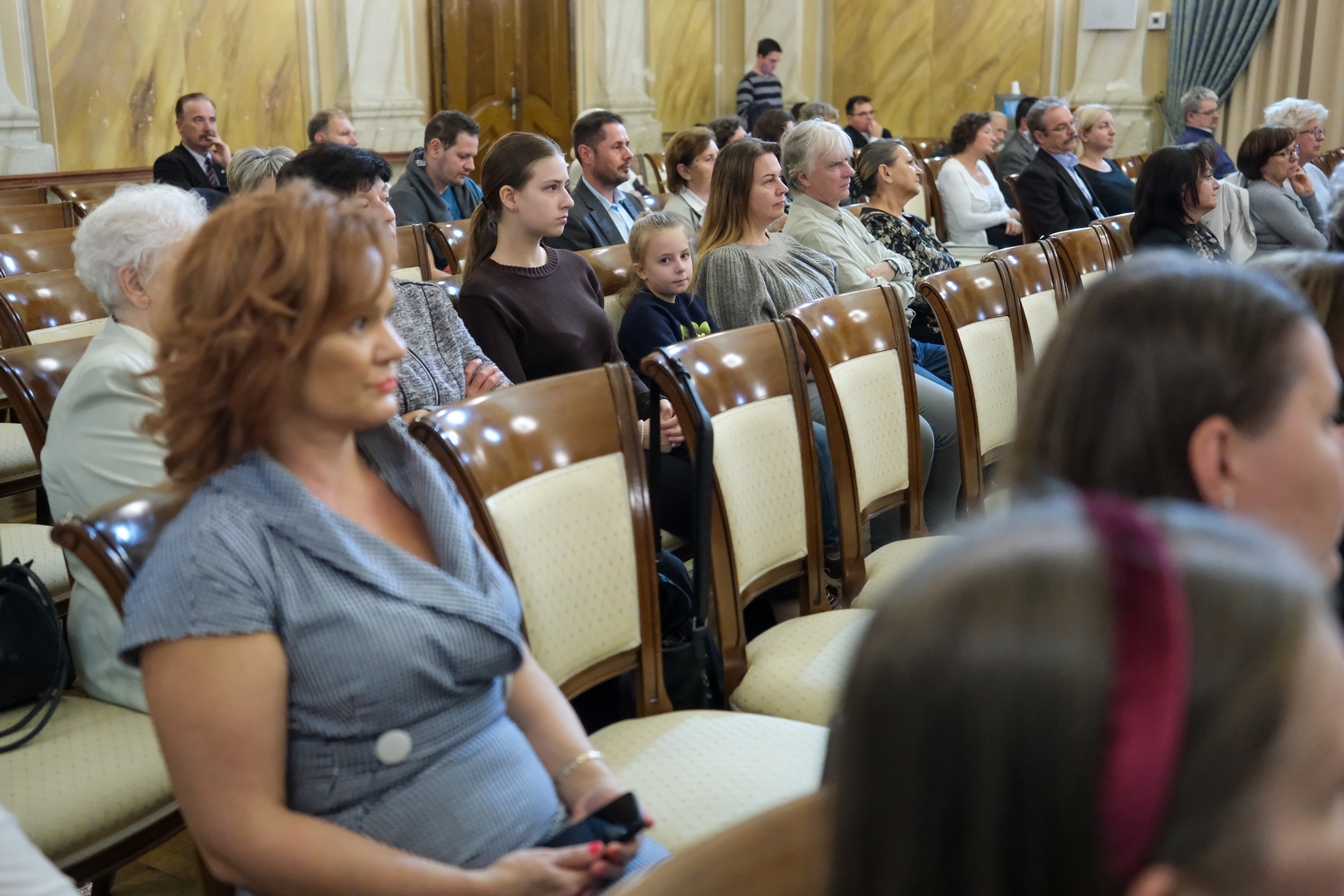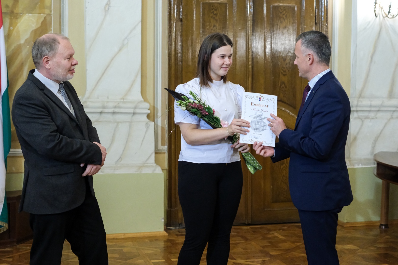A köszöntő után adta át a díjakat a polgármester és Somogyváry Ákos, az Erkel Ferenc Társaság elnöke, amelyeket idén Kovács Dorka, a Magyar Képzőművészeti Egyetem vizuális művészet szakos hallgatója, Burda Adrienn, a Széchenyi István Egyetem tervezőgrafikus szakos hallgatója, valamint Mundruczó Nóra – aki nem tudott jelen lenni az eseményen –, a Moholy-Nagy Művészeti Egyetem tervezőgrafikus szakos hallgatója.