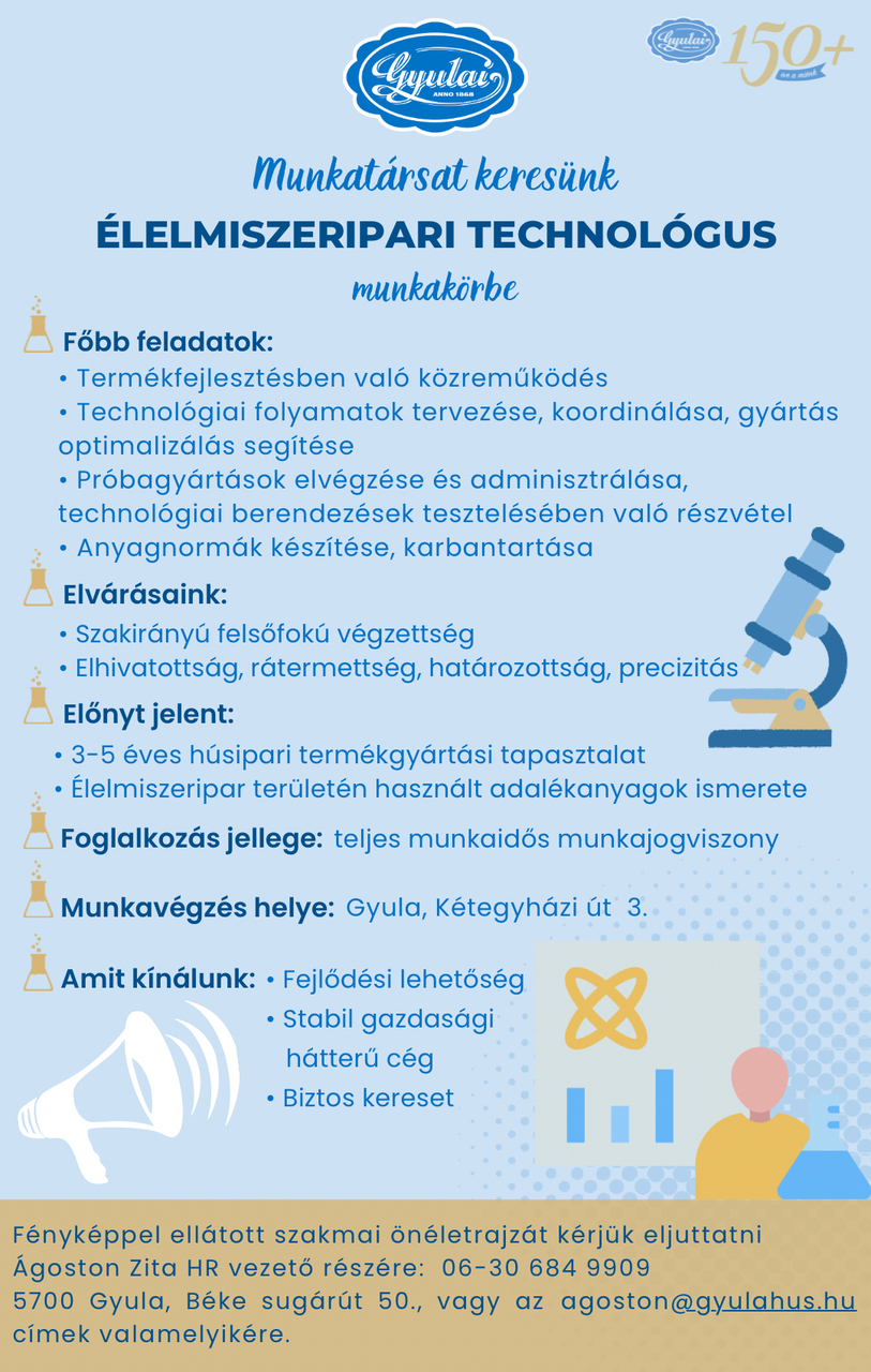 Élelmiszeripari technológust keres a Gyulahús Kft.