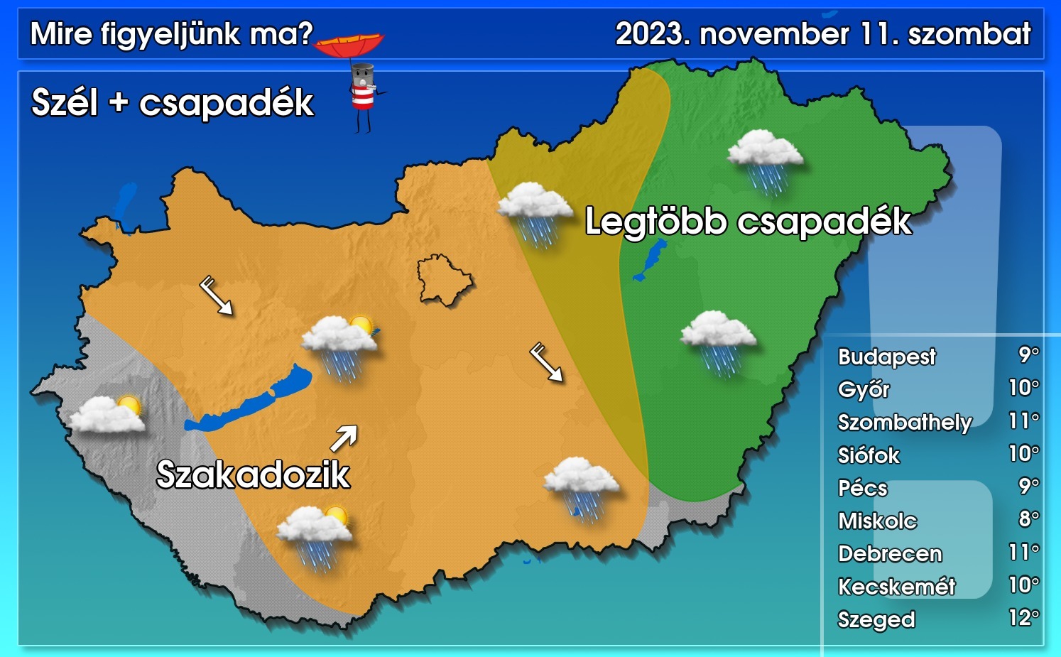 Délnyugat felől újabb csapadékzóna érkezett, amely északkelet felé terjeszkedik: több helyen eshet az eső, majd késő délutántól délnyugat felől szakadozni, vékonyodni kezd a felhőzet. Ezzel együtt a csapadékhajlam is csökkenni kezd, de az északkeleti régióban végig kitarthat a borongós, csapadékos idő. Az északnyugati szél délutántól nagy területen lesz élénk, főleg a szélcsatornában erős széllökések is előfordulhatnak.