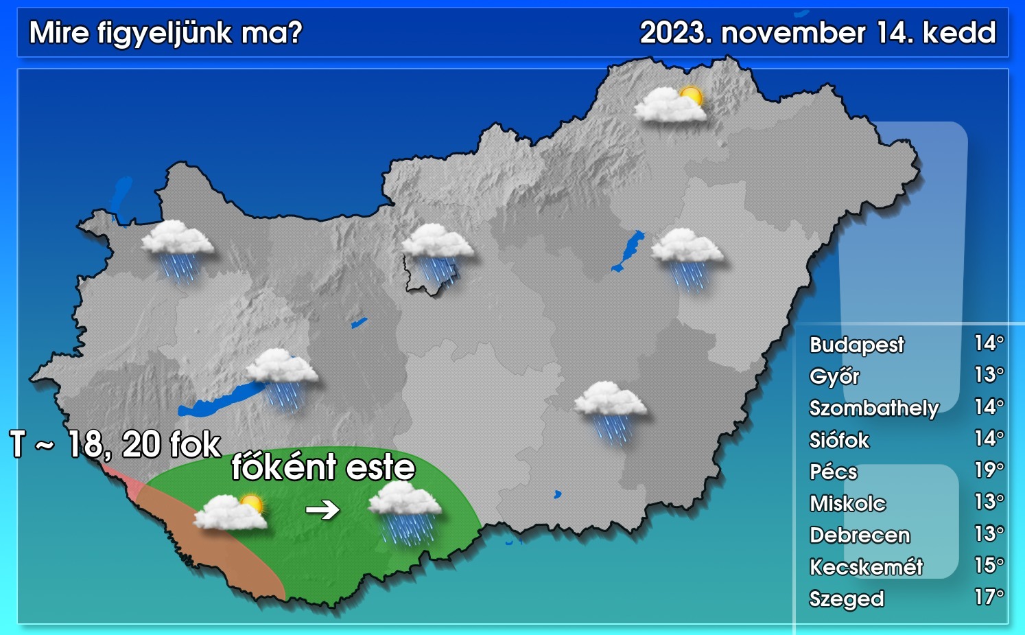 Ma borongós és csapadékos, egy szóval őszi időre készülhetünk: elérte hazánkat egy hullámzó frontrendszer, amelyből többfelé lehet esőre, záporra számítani. A csapadék időbeli lefolyásában nagy a bizonytalanság, valószínűleg lesznek olyan területek, ahol hosszabb száraz időszakok is lesznek. Estétől kiemelten a délnyugati vidékeken (zölddel jelölve) jelentős mennyiségű csapadék is hullhat, emellett a délnyugati határvidéken akár 18, 20 fokig is emelkedhet a hőmérséklet. Az ország többi részén sem fogunk igazán fázni, hiszen nagyrészt 13 és 15 fok körül alakul a maximum-hőmérséklet, a hőérzetünkön azonban az élénk, helyenként erős déli szél ronthat.