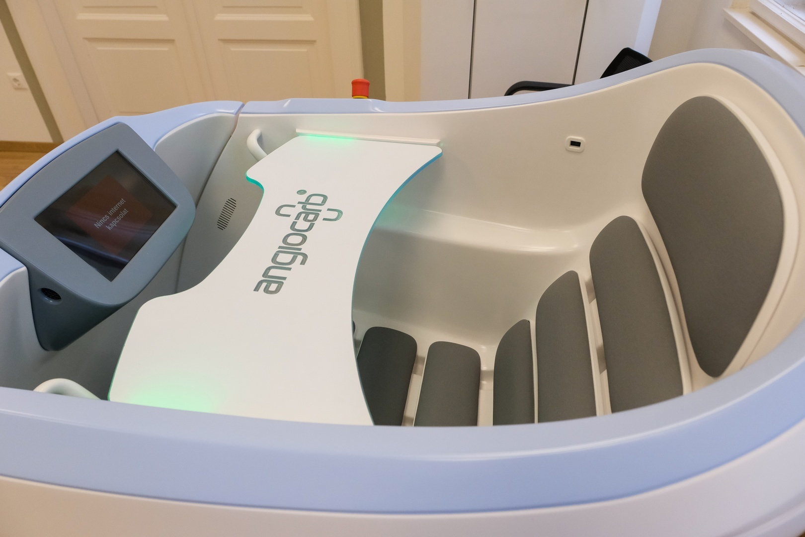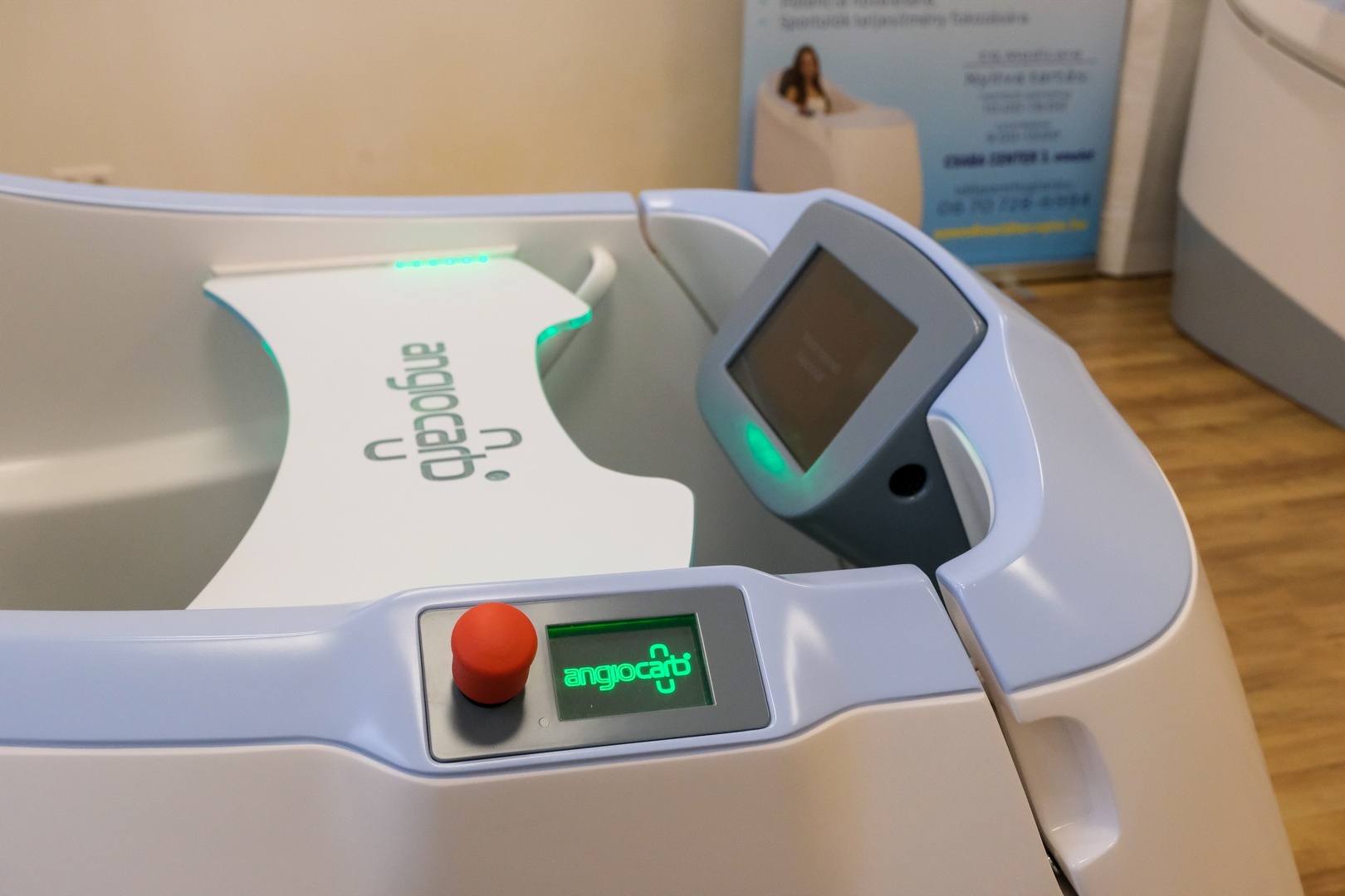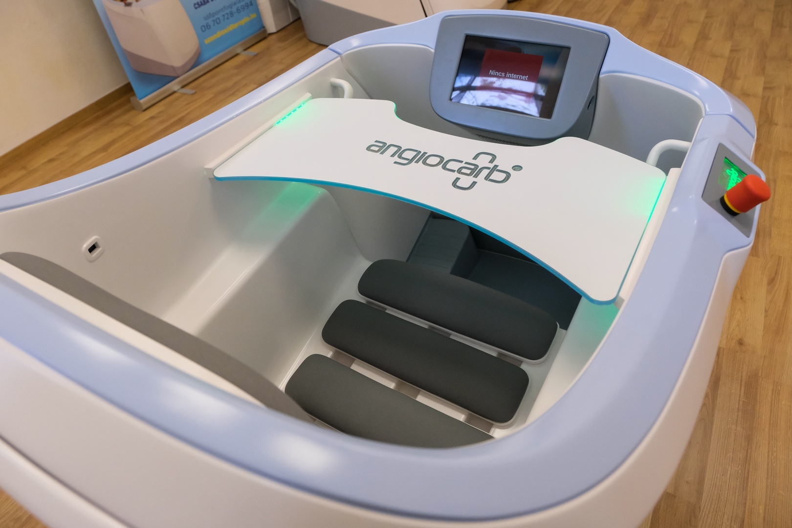 Mint megtudtuk, az AngioCarb mobil mofettaeszközbe – amely egy fémből és műanyagból készült, kényelmes kabin – a lábfejek környékén vezetik be a szén-dioxiddal dúsított levegőt, amely a bőrön keresztül szívódik fel. Hatására kitágulnak a bőr erei, fokozódik a hajszálerek keringése, és megnő a véráramlás sebessége.