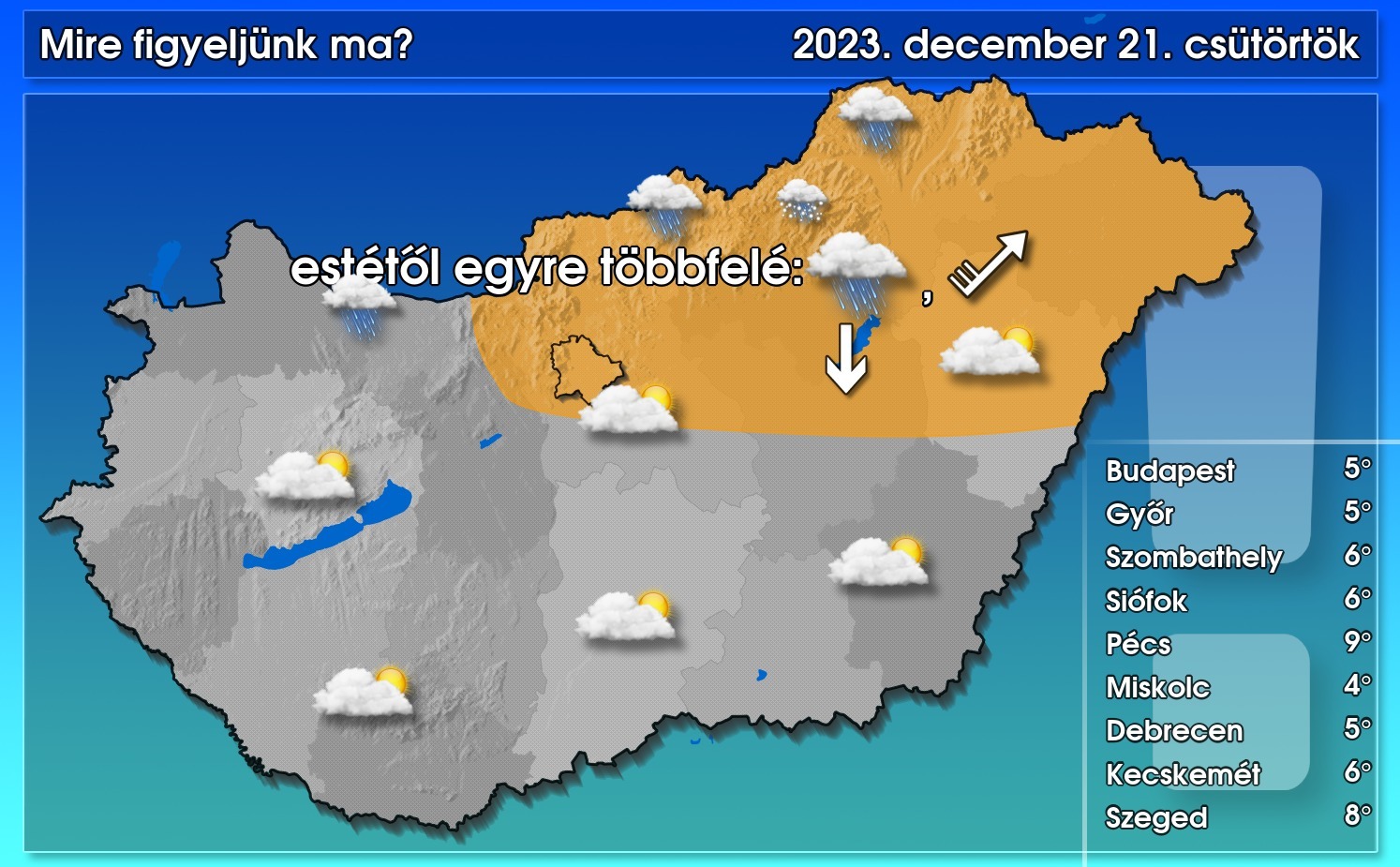 - estig inkább csak az északi határvidék közelében eshet az eső (néhol esetleg havas eső), majd ezt követően észak felől egyre többfelé lesz szükség az esernyőkre