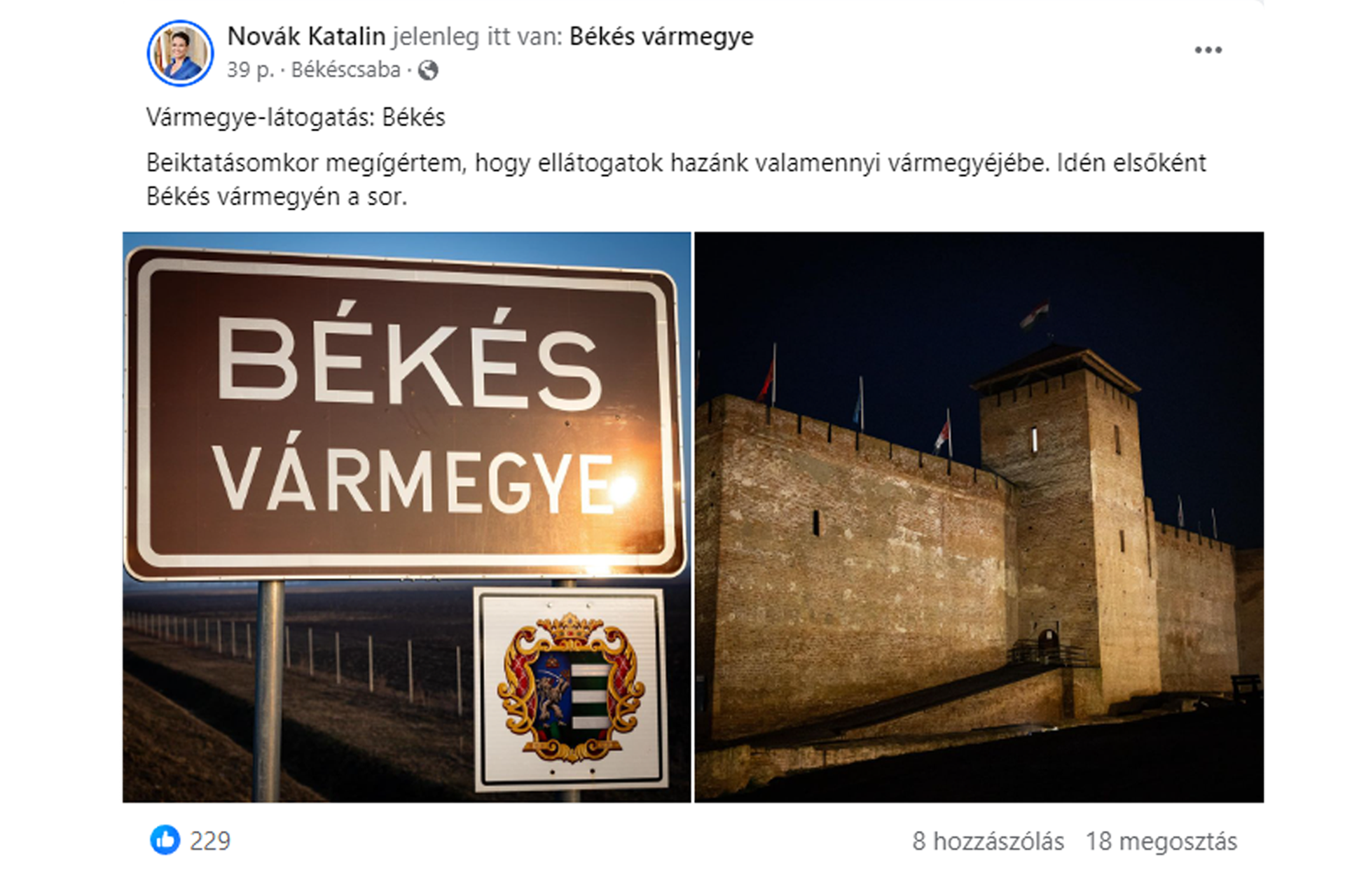 Néhány perce közösségi oldalán azt írta, „beiktatásomkor megígértem, hogy ellátogatok hazánk valamennyi vármegyéjébe. Idén elsőként Békés vármegyén a sor.”