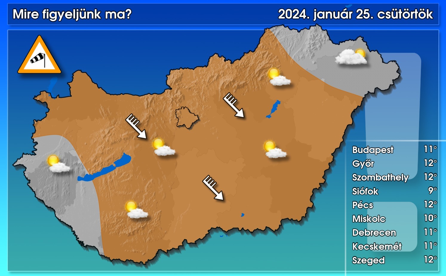 Szeles, de enyhe nap elé nézünk: a következő órákban tovább erősödik a szél, és hazánk nagy részén viharos lökésekre is számíthatunk. A szél a felhőket is gyorsan szállítja, így általában felhőátvonulás várható többórás napsütéssel, 10 fok feletti maximummal. Szabolcs északkeleti részén több maradhat a felhő, ott hűvösebb idő valószínű. Zápor legfeljebb elvétve lehet.