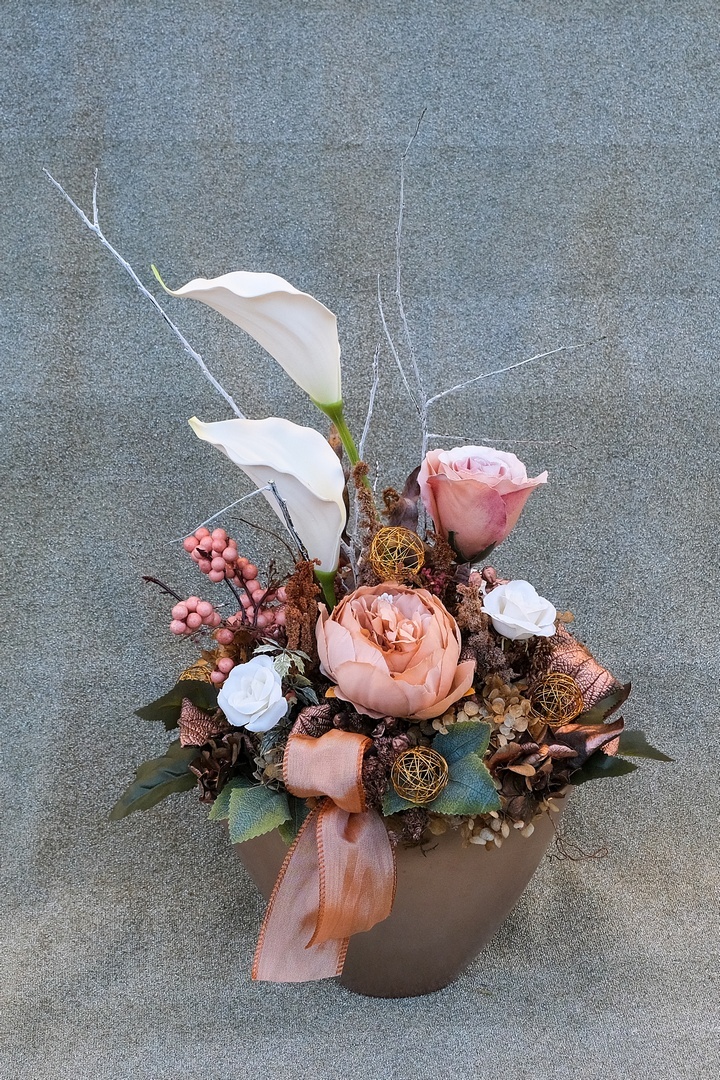 Többféle virágkompozíció kapható az év trendszínében a Patócsy Ferenc utcai Tünde virágüzletben.