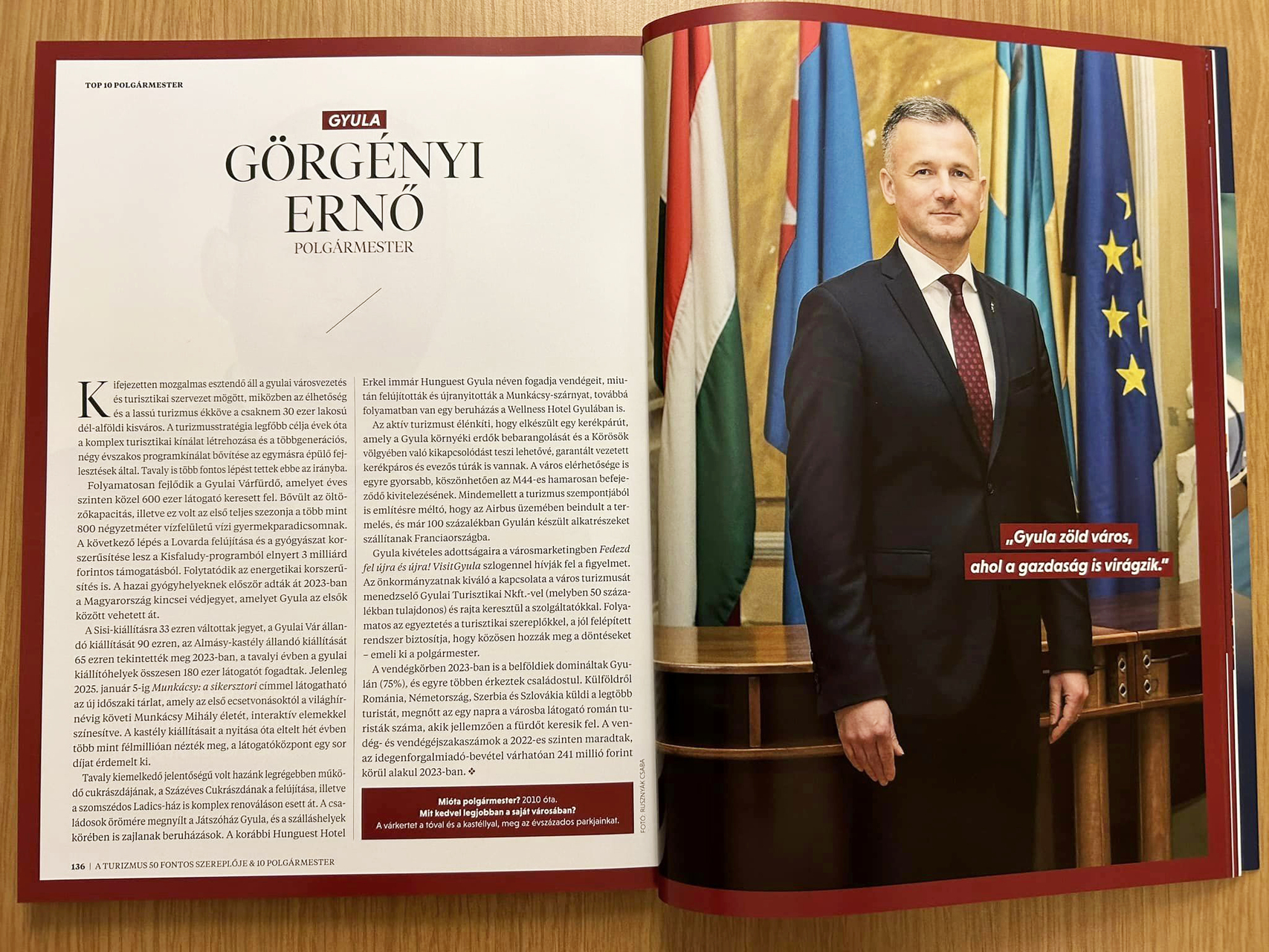 Magyarország tíz turisztikailag kimagasló településének polgármesterei közé választották a gyulai városvezetőt a Turizmus 50 fontos szereplője & top 10 polgármester című kiadványban.