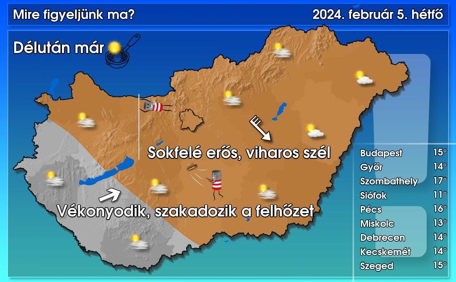 A szél továbbra is kellemetlenséget okoz, nem csillapodik, sőt, nagy területen tovább erősödik, viharossá fokozódik. Délnyugat, nyugat felől egyre nagyobb területen vékonyodik, szakadozik a felhőzet, és egyre többfelé a szűrt napsütés válik jellemzővé a fátyolfelhők mellett. Reggel, délelőtt még előfordulhat helyenként kisebb eső, zápor – egyre inkább északkeleten –, később már sehol sem valószínű érdemi csapadék. Az ország délnyugati harmadát leszámítva sokfelé lesz erős, viharos az északnyugati, nyugati szél, a légmozgás csupán késő délutántól, estétől kezd veszíteni erejéből. A legmagasabb nappali hőmérséklet 10 és 19 fok között várható.