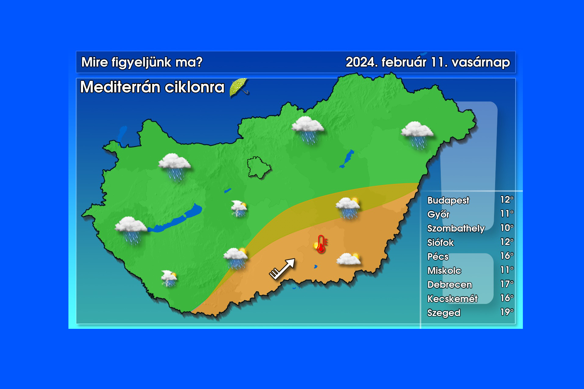 Jó reggelt! Mediterrán ciklon alakítja időjárásunkat, melynek hatására mozgalmas nap elé nézünk. Főként a zöld színnel jelölt területen számíthatunk többfelé esőre, záporra. Délkelet felől szakadozásnak indul a felhőzet, de ezt követően beindul a gomolyképződés is, így délutánra egyre inkább záporossá válik a csapadék, sőt, délután a Dél-Dunántúlon, késő délutántól, estétől elsősorban egy délnyugat-északkeleti tengely mentén másutt is számottevő esély nyílik zivatarok kialakulására. A szél leginkább a narancssárga területen lesz erős, helyenként viharos. A hőmérséklet pedig továbbra is a kora tavaszt idézi. A felhősebb, csapadékosabb tájakon 9, 14, délkeleten 15, 20 fok közötti maximumokra számíthatunk, sőt a mai napra vonatkozó melegrekord is veszélyben van (20,1 fok, Ásotthalom -1958) – írta közösségi oldalán a HungaroMet Nonprofit Zrt.