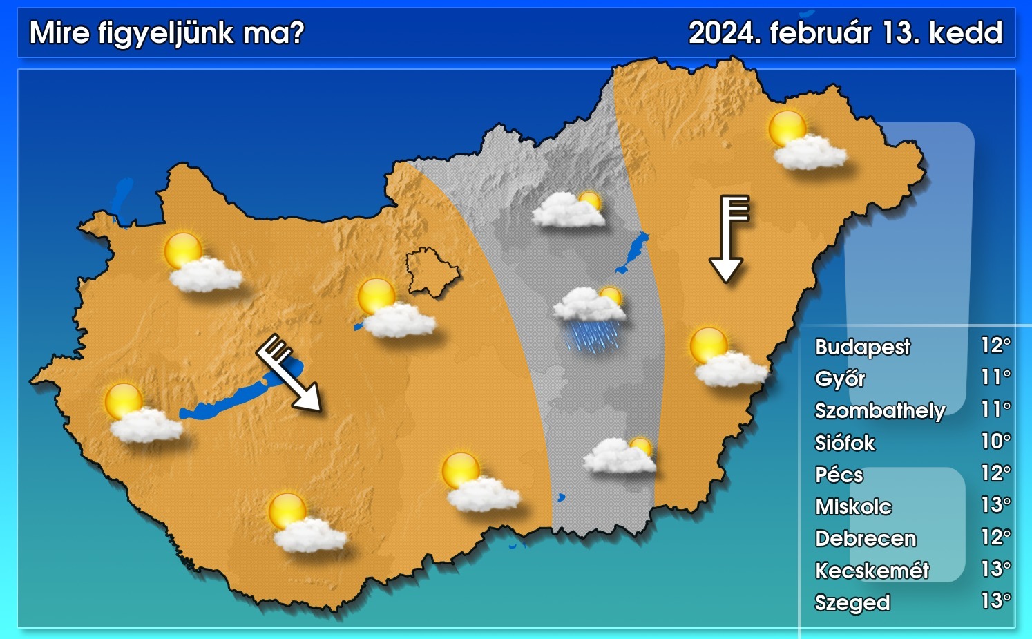 A Dunántúlon erős északnyugati, míg a Tiszántúlon erős északi szél várható, ennek köszönhetően pedig egy összeáramlási zóna is kialakul a köztes tájakon, ahol egész nap felhős idő várható és ott záporok is kialakulhatnak. Másutt gomoly- és fátyolfelhők zavarják majd a többórás napsütést. A hőmérséklet az ország döntő részén 10 és 13 fok között alakul, tehát még mindig jóval a sokéves átlag feletti értékekre számíthatunk.