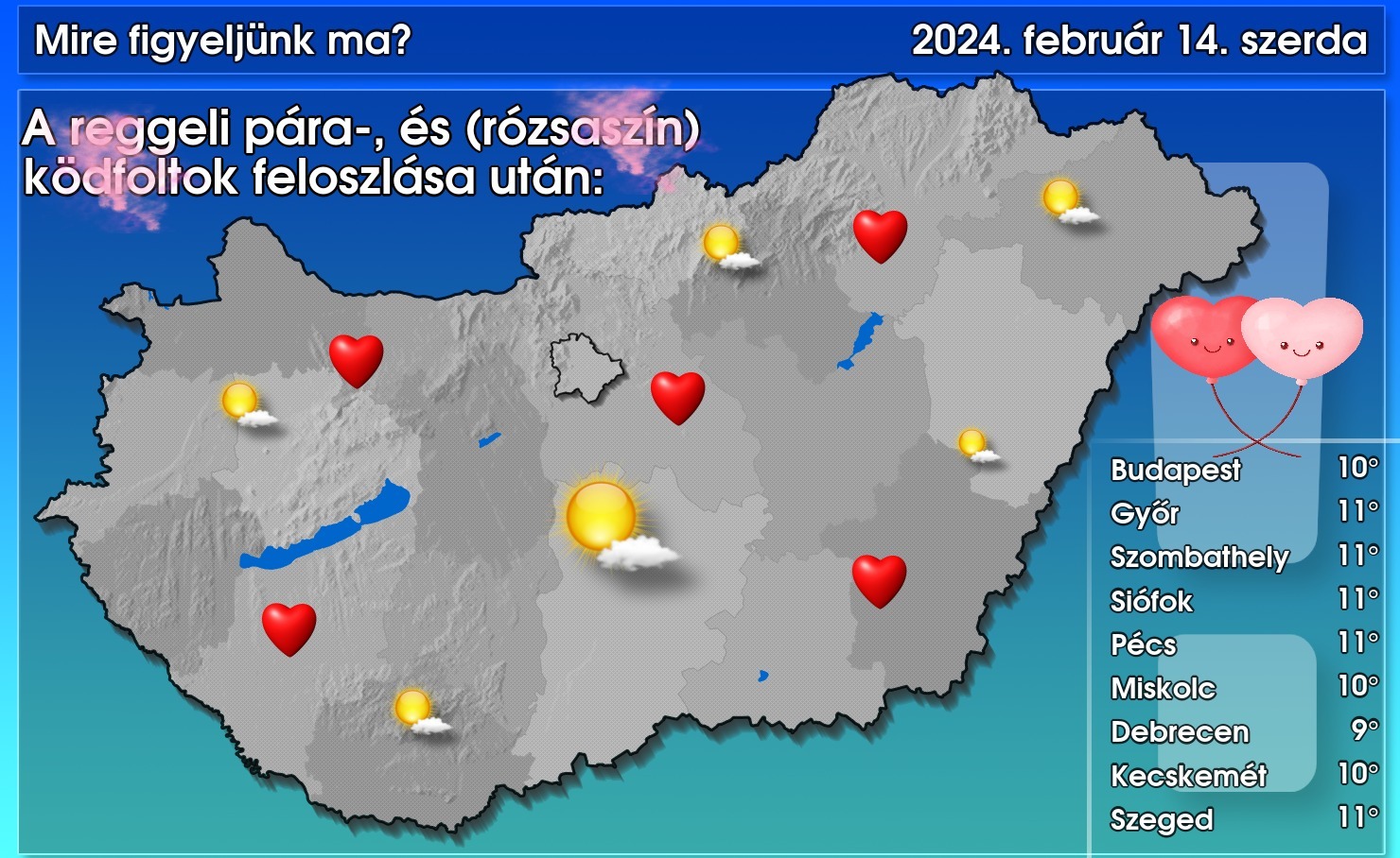 Bálint és Valetin napján az időjárás kedvező lesz egy romantikus andalgáshoz a szabadban. A kevés gomoly- és fátyolfelhő mellett sok napsütésre számíthatunk, csapadék sem várható. Az északi, északnyugati szelet a Tiszántúlon kísérhetik élénk lökések. A legmagasabb nappali hőmérséklet nagyrészt 9 és 12 fok között várható.