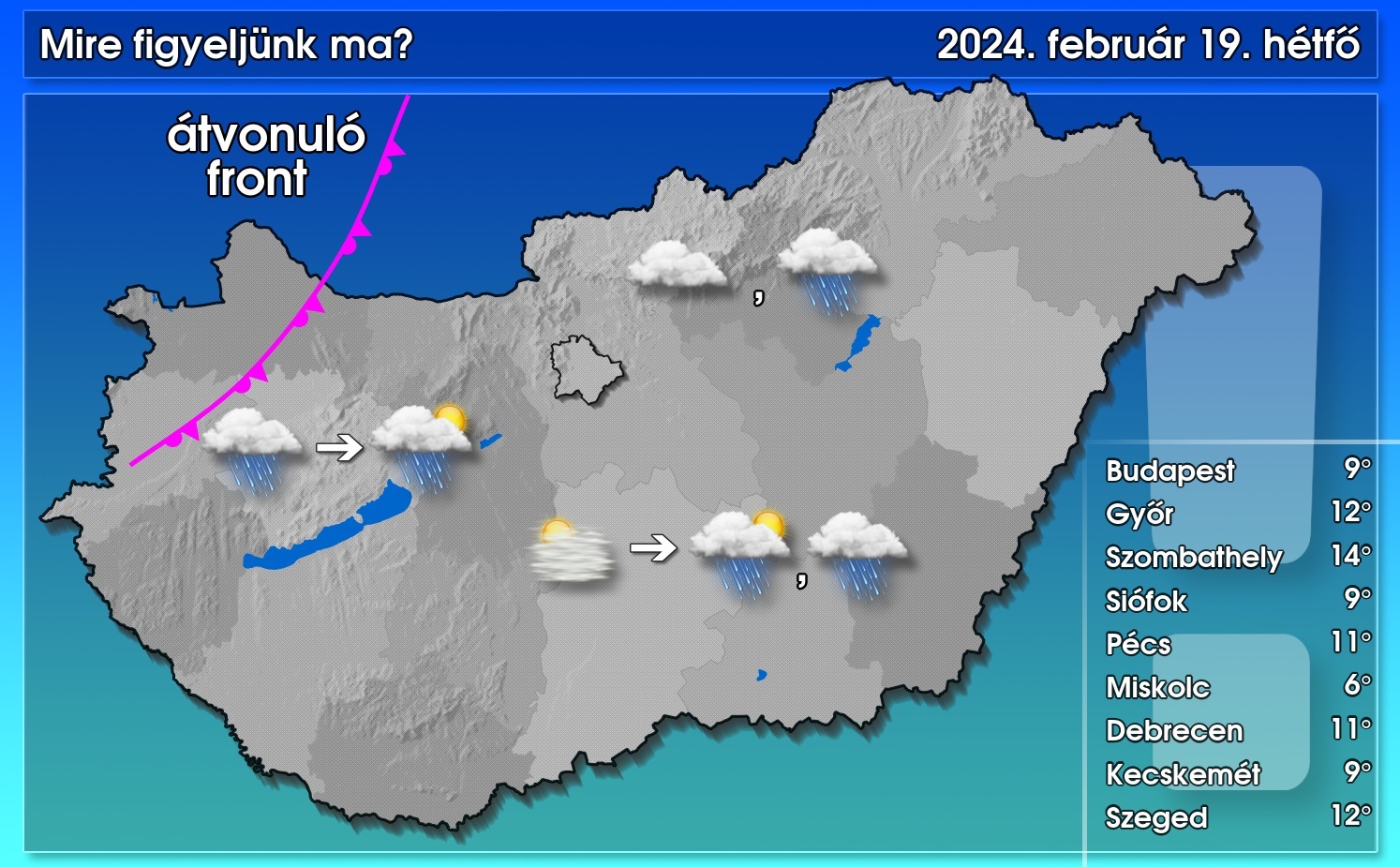 Újabb front vonultatja fel felhőzetét, és okoz elszórt jelleggel esőt, záporesőt. Ma összességében a felhőzet lesz túlsúlyban, de reggel, délelőtt a délkeleti tájakon még lehet szűrt napsütés, illetve délután már nyugat felől szakadozgathat a felhőzet, és rövid időre a nap is előbukkanhat. Az északnyugat felől érkező frontális csapadékzóna fokozatosan délkelet felé tevődik, majd mögötte is kialakulhatnak záporok. A szél csak kevés helyen élénkülhet meg – írta a HungaroMet NZrt. posztjában.