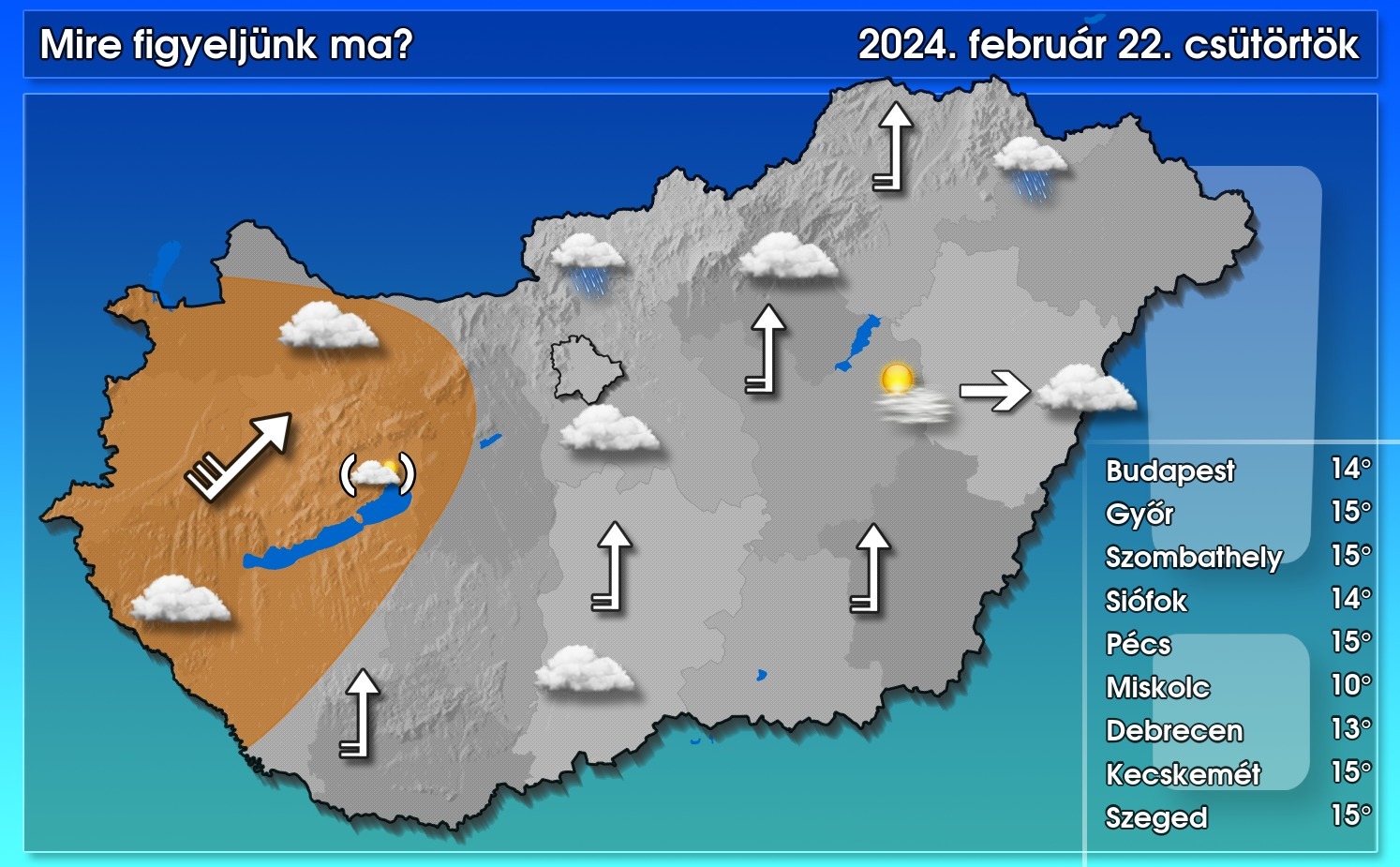 Ma többnyire erősen felhős vagy borult időre számíthatunk, bár eleinte keleten szűrt napsütés még előfordulhat. Kisebb esőre az északi országrészben van esély. Délután a nyugati részeken szakadozhat a felhőzet, és arrafelé, rövid időre, előbukkanhat a nap is. A déli, délnyugati szél egyre nagyobb területen megélénkül, megerősödik, az Észak-, valamint Nyugat-Dunántúlon viharos lökések is lehetnek. A csúcsérték döntően 11 és 16 fok között alakul, azonban az északi völgyekben hűvösebb maradhat az idő.