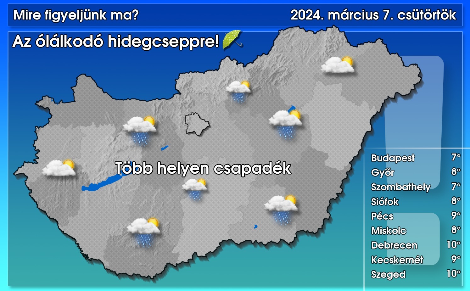 Hidegcsepp lesz felettünk, emiatt jobbára erősen felhős lesz az ég, de időnként szakadozottabbá válhat a felhőzet, rövid időre a nap is kisüthet. Több helyen kell záporra, esetleg kisebb esőre számítani. Az északi, északkeleti majd keleties szél élénk lesz, melyhez a Nyugat-Dunántúlon és az északkeleti tájakon olykor erős lökések társulhatnak.