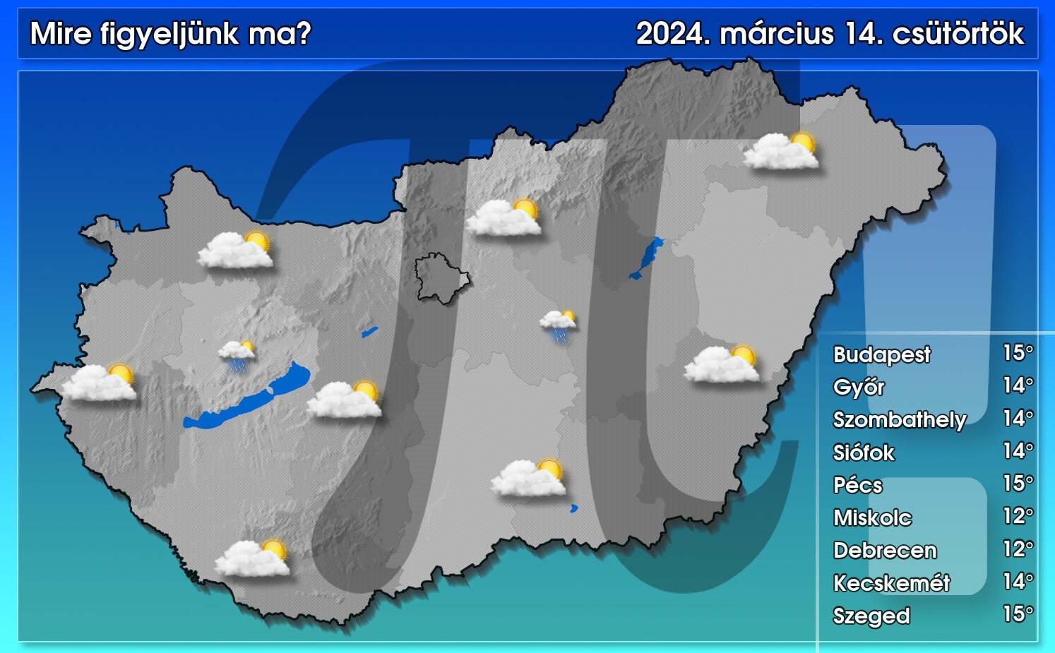 Ma a keleti részeken lévő összeáramlás fokozatosan leépül, és ott is, mint máshol, gomolyosodik a felhőzet. A gomolyfelhők délután jobban össze is állhatnak, de zápor csak helyenként alakulhat ki. A légmozgás nem lesz jelentős, néhol kísérhetik élénk lökések az északi szelet, a hőmérséklet pedig 11 és 16 fok között alakul.