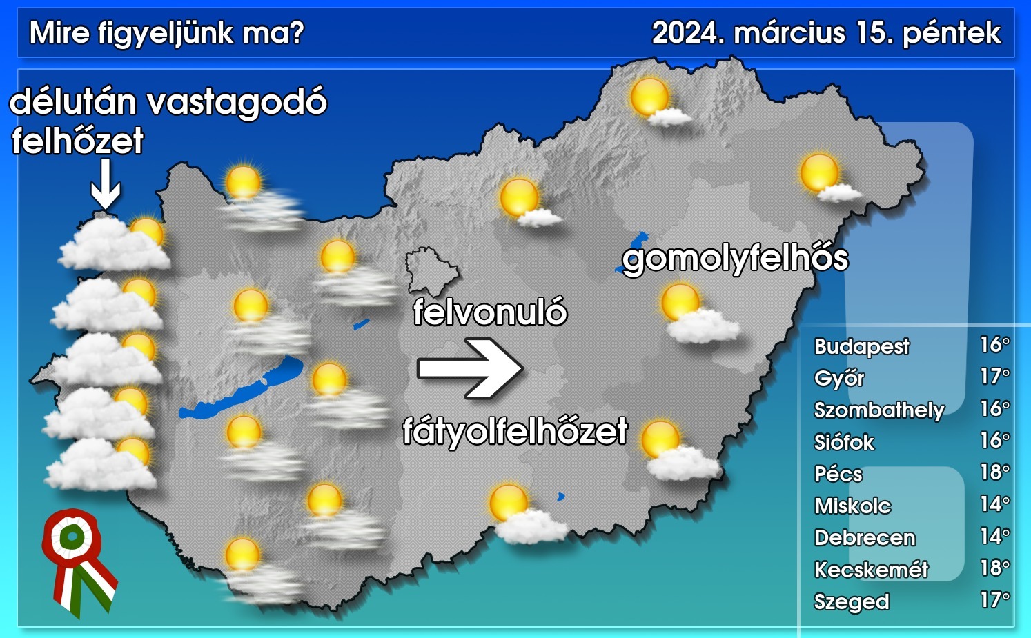 Gomolyfelhős, napos időre van kilátás, ugyanakkor nyugat felől fátyolfelhőzet vonul fel, ami fokozatosan meg is vastagszik. Számottevő csapadék nem várható. A csúcshőmérséklet 13, 18 fok között alakul.