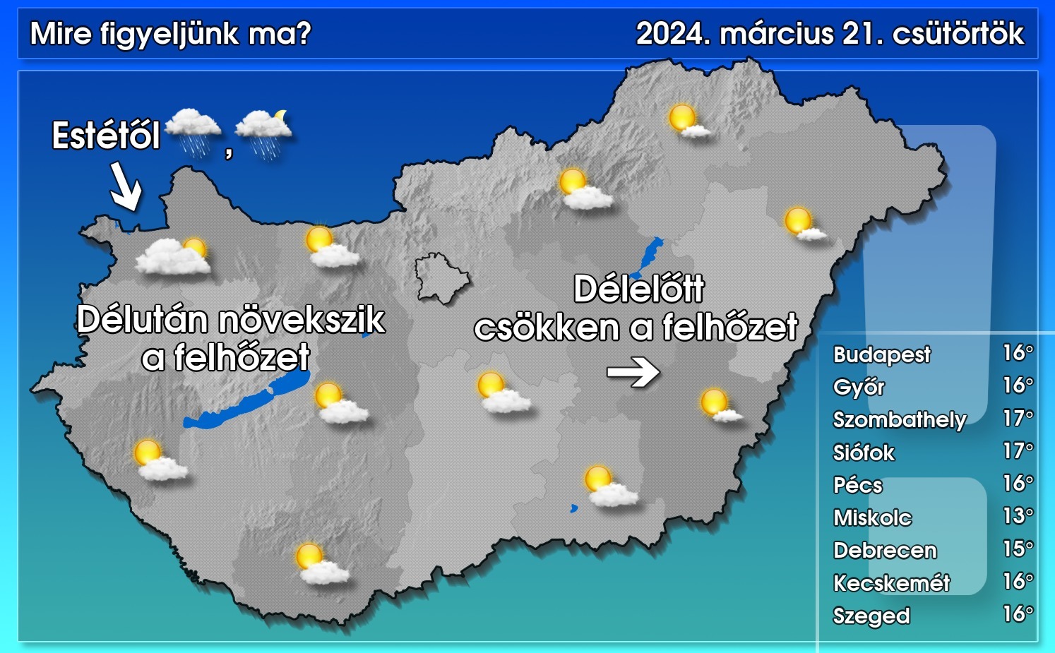 Ma fátyolfelhős idő várható általában szűrt napsütéssel, de az északnyugati tájak kivételével napközben átmenetileg el is vékonyodhat, csökkenhet a magasszintű felhőzet. Délután viszont nyugat felől megnövekszik, megvastagszik a felhőtakaró. Estétől a Dunántúlon, főként annak nyugati felén, helyenként kisebb eső, zápor előfordulhat, addig csapadék nem lesz. A légmozgás többnyire gyenge vagy mérsékelt marad, este azonban a szél a Dunántúl nyugati részein északnyugati irányba fordul és néhol megélénkül. A legmagasabb nappali hőmérséklet csütörtökön 13 és 19 fok között várható.