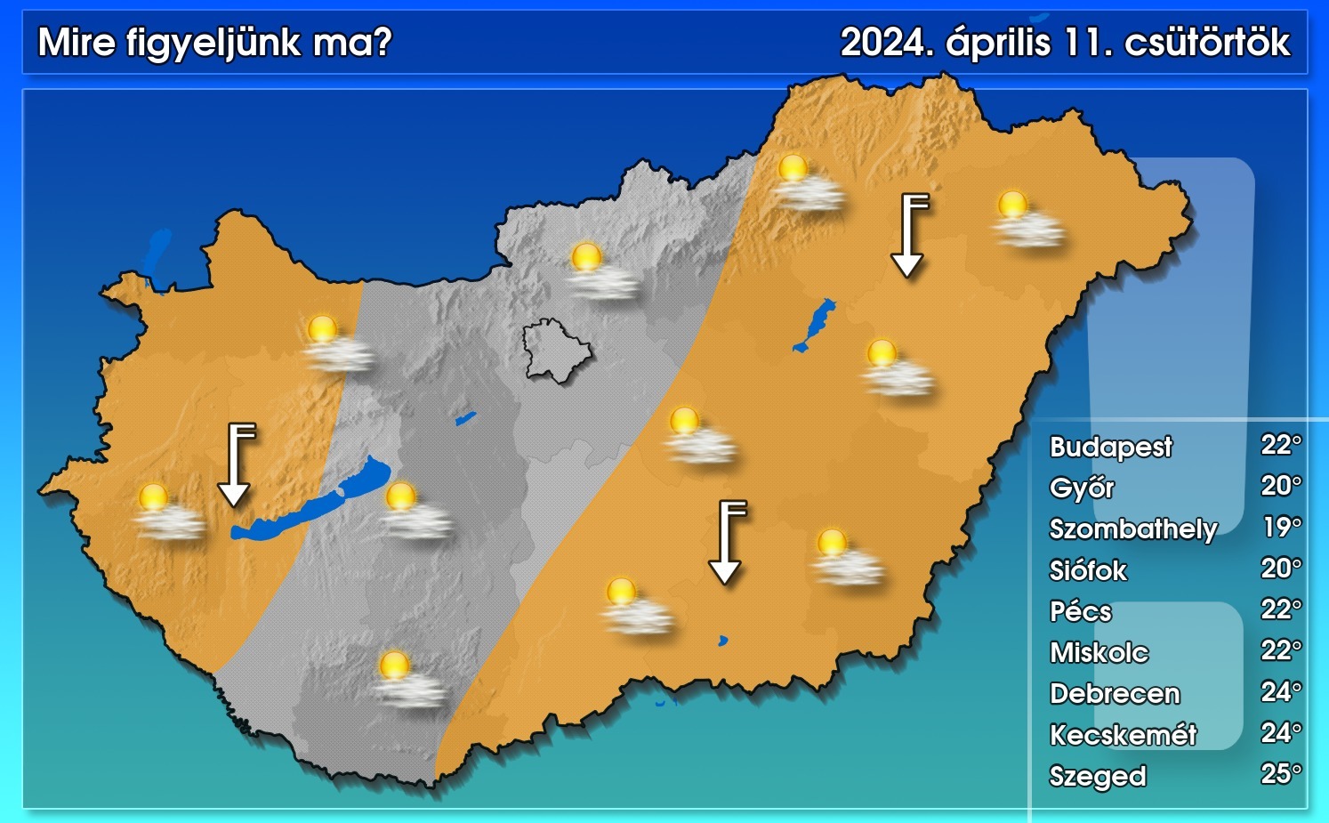 Ma tehát fátyolfelhős, napos, száraz időnk lesz. Napközben még többfelé, főleg a narancssárgával jelölt zónákban megélénkül az északias szél. A hőmérséklet délután 19 és 26 fok között valószínű.