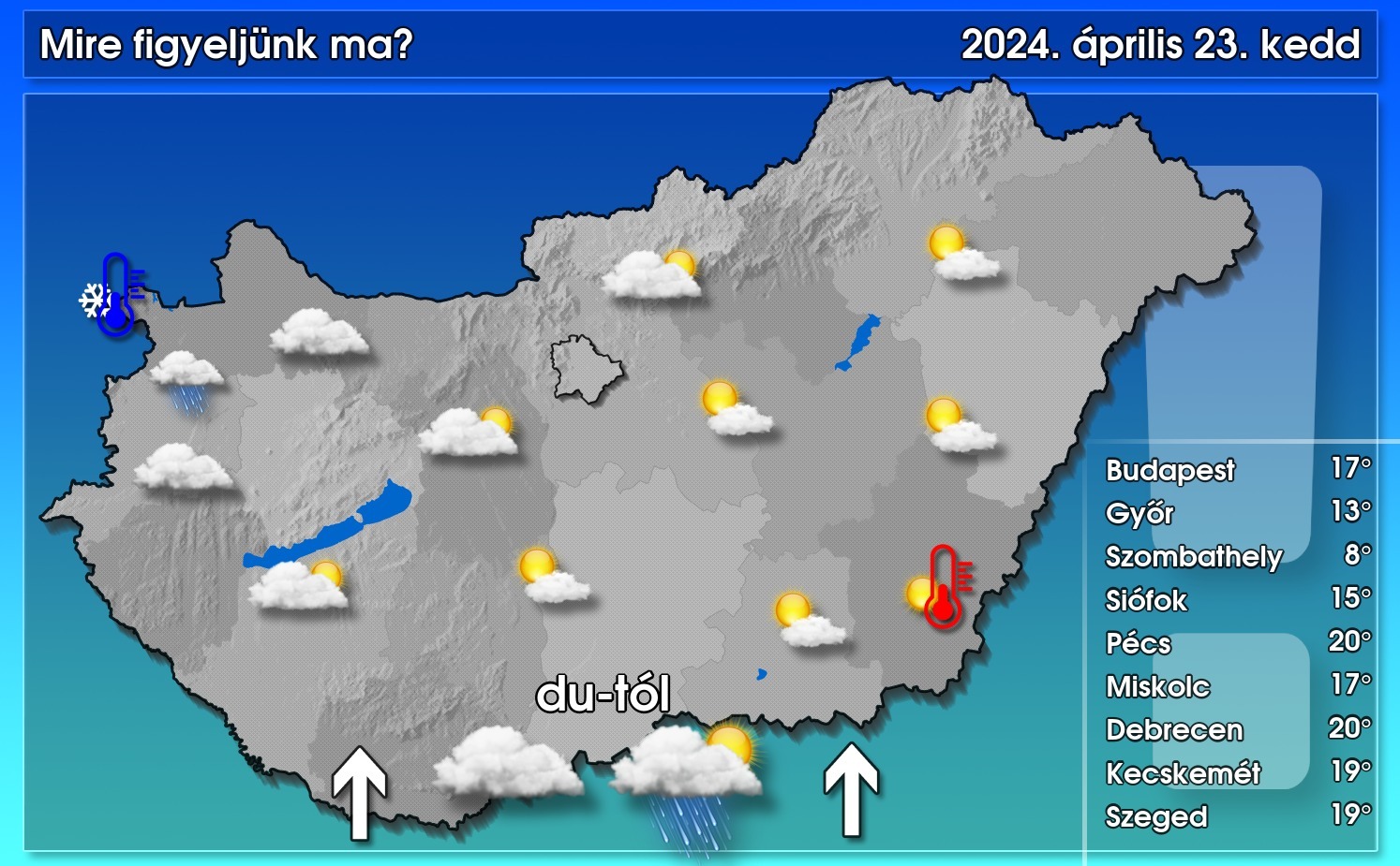 Az Északnyugat-, Nyugat-Dunántúlon döntően borult marad az ég, és a csapadékhajlam átmenetileg csökken. Máshol a hosszabb-rövidebb napos időszakot követően erősen megnövekszik a felhőzet, és délutántól, késő délutántól eső, záporeső is egyre több helyen várható, néhol zivatar is kialakulhat. A szél élénk, néhol erős lesz. A hőmérsékletben jelentős kontraszt alakul ki: északnyugaton 10 fok alatt maradhat, a délkeleti, keleti részeken pedig a 20 fokot is meghaladhatja a maximum.