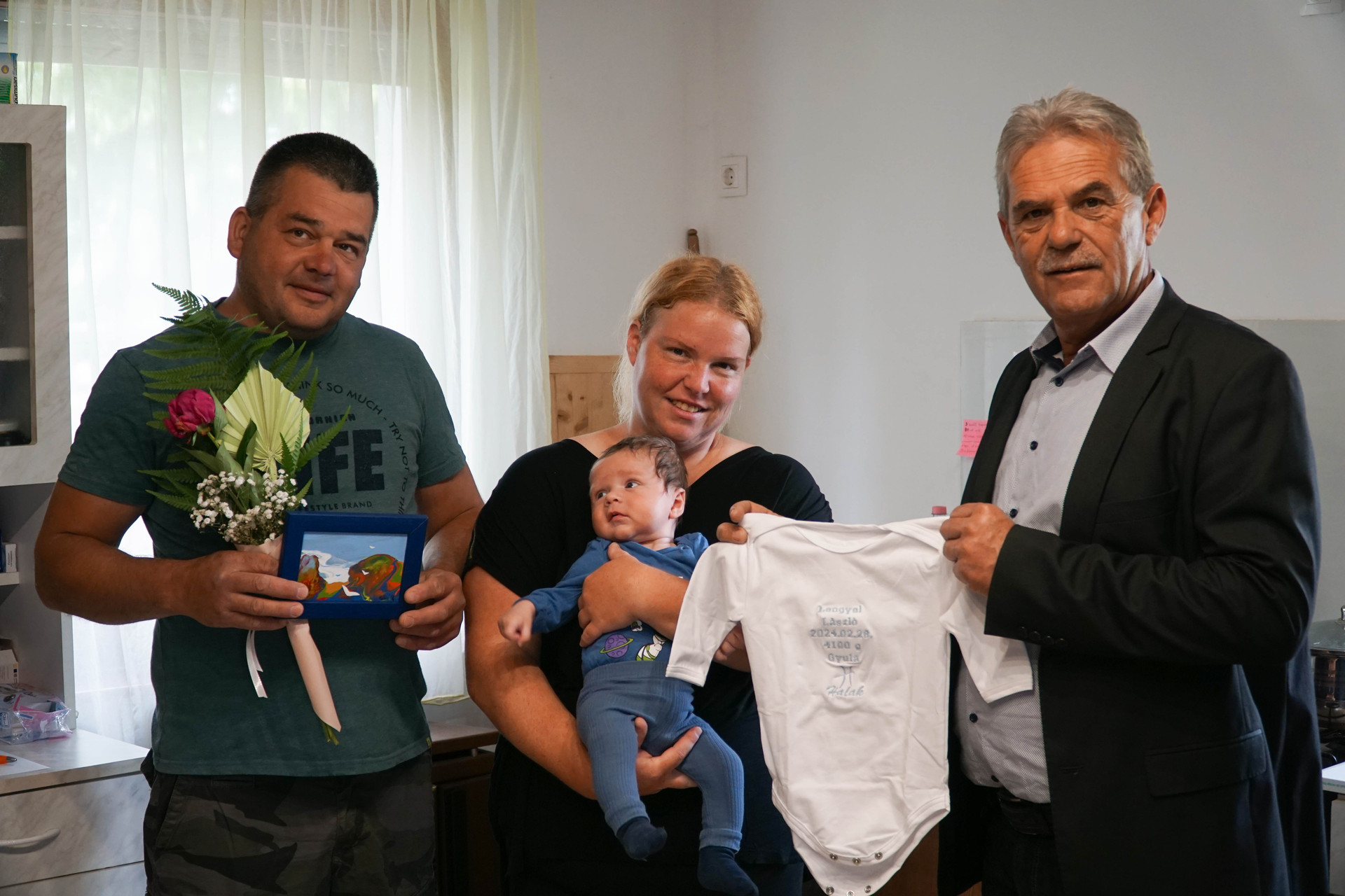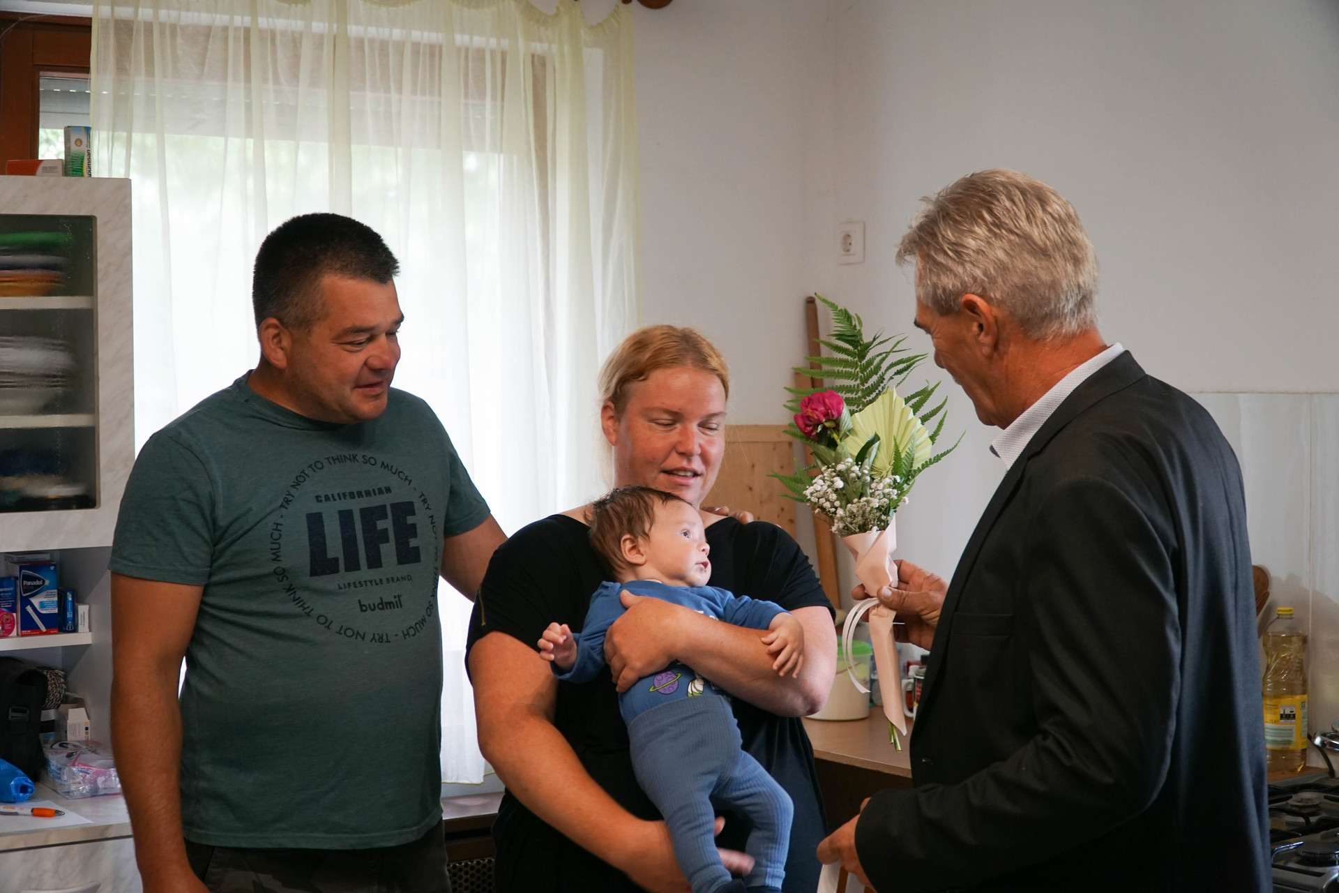 Lengyel Lászlót köszöntötte a gyulai babaruhaprogram keretében Szabó Károly önkormányzati képviselő május 23-án.