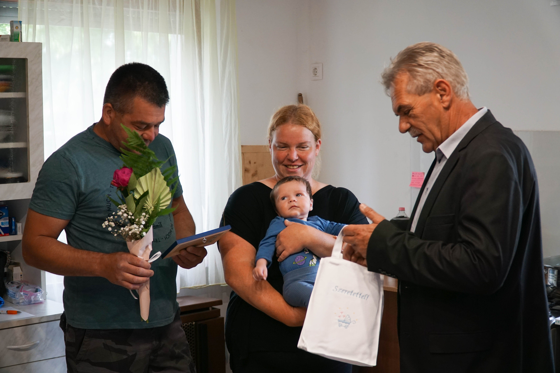 A csecsemőt és édesanyját egyedi hímzésű babaruhával, Póka György festményével és virágcsokorral lepte meg a képviselő.