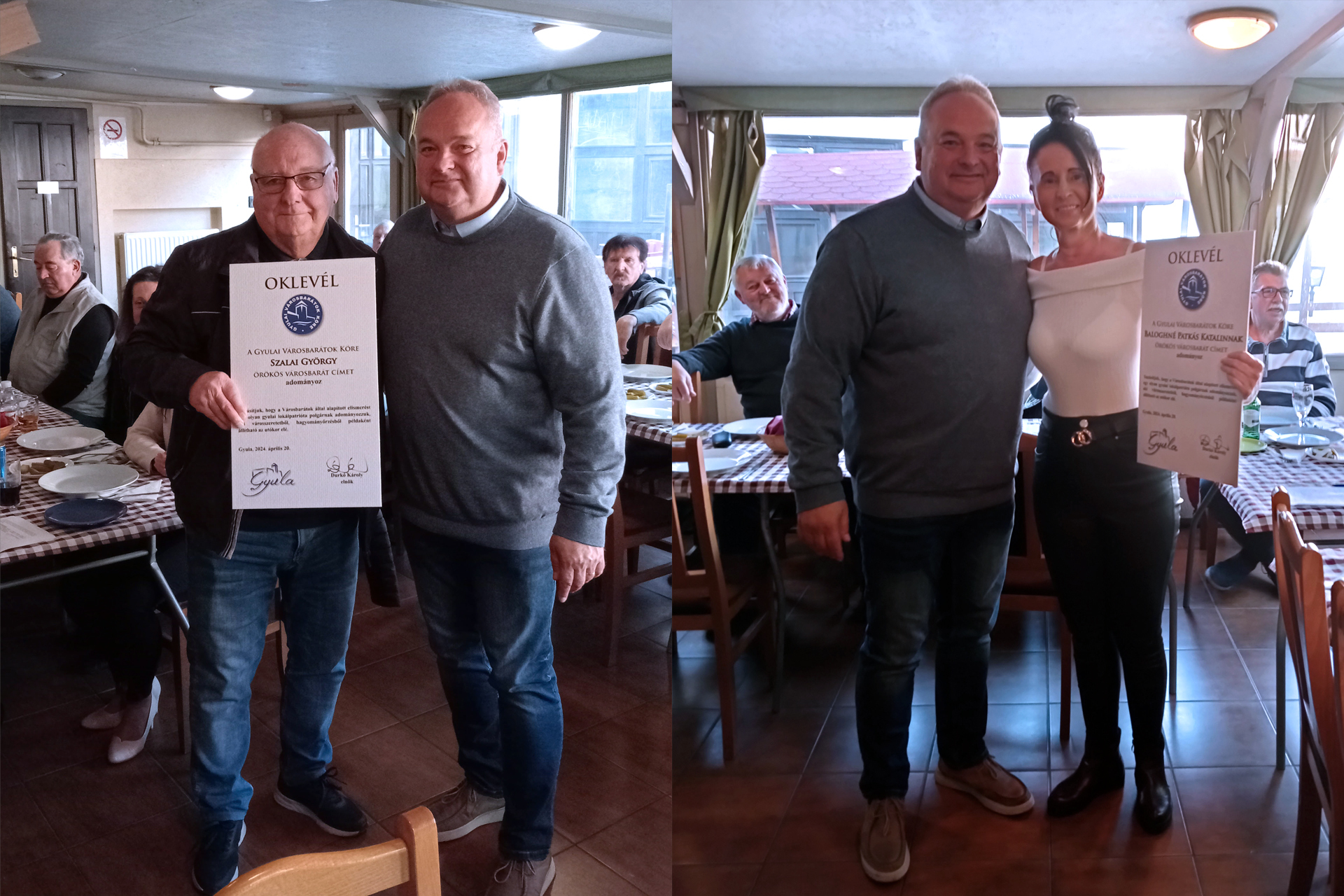 Örökös Városbarát címet kapott Szalai György és Balogné Patkás Katalin, az erről szóló oklevelet a Gyulai Városbarátok Körének éves közgyűlésén adta át a szervezet vezetője, Durkó Károly.