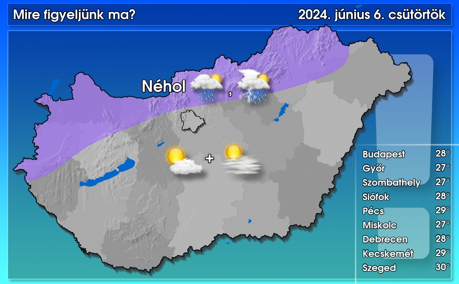 Ugyan hidegfront súrolja hazánk északnyugati részeit, de ott is csökken majd a felhőzet, és naposra fordul az idő. Azonban délután a magasabbra törő gomolyfelhőkből leginkább az északi, északnyugati megyéinkben előfordulhatnak majd záporok, zivatarok. A déli, délnyugati szél csak zivatarok környezetében lehet erős, viharos. Délután 25, 31 fok között alakul a hőmérséklet.