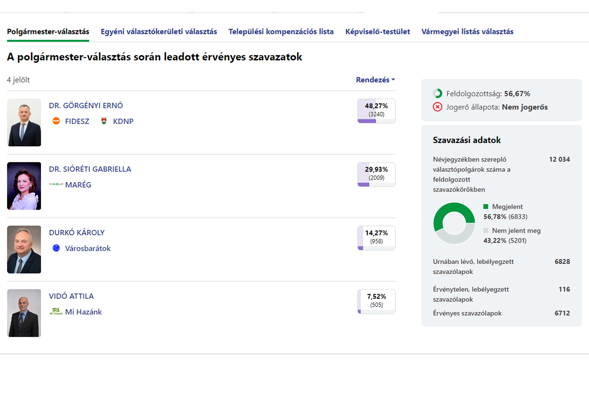 56,67%-os feldolgozottságnál Görgényi Ernő vezet