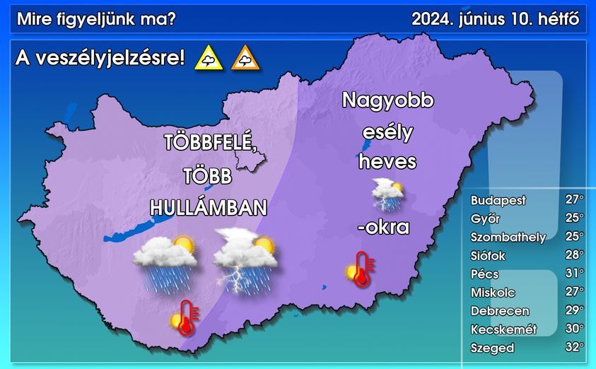 Ma érdemes minél gyakrabban rápillantani az aktuális veszélyjelzésre, figyelmeztető előrejelzésre, riasztásra – a mai nap folyamán ugyanis a fölénk helyeződő frontrendszer hatására a napsütés melletti erőteljes gomolyfelhő-képződésből többfelé számíthatunk záporra, zivatarra (akár ismétlődő jelleggel), emellett elsősorban a sötétebb lilával jelölt zónában eléggé kedvező feltételek állnak fenn heves zivatarok kialakulásához (ezeket nagy méretű jég, felhőszakadás, erősen viharos szélrohamok kísérhetik). A zivatarok kialakulásában és hevességében nagy a bizonytalanság, többek között a légkörben jelen lévő szaharai por miatt is. A hőmérséklet csúcsértéke főként délen, délkeleten még többfelé elérheti, meghaladhatja a 30 fokot, északon, északnyugaton azonban már inkább 25 fok körül, vagy az alatt alakulhat több ponton is – írták a HungaroMet NZrt. posztjában.