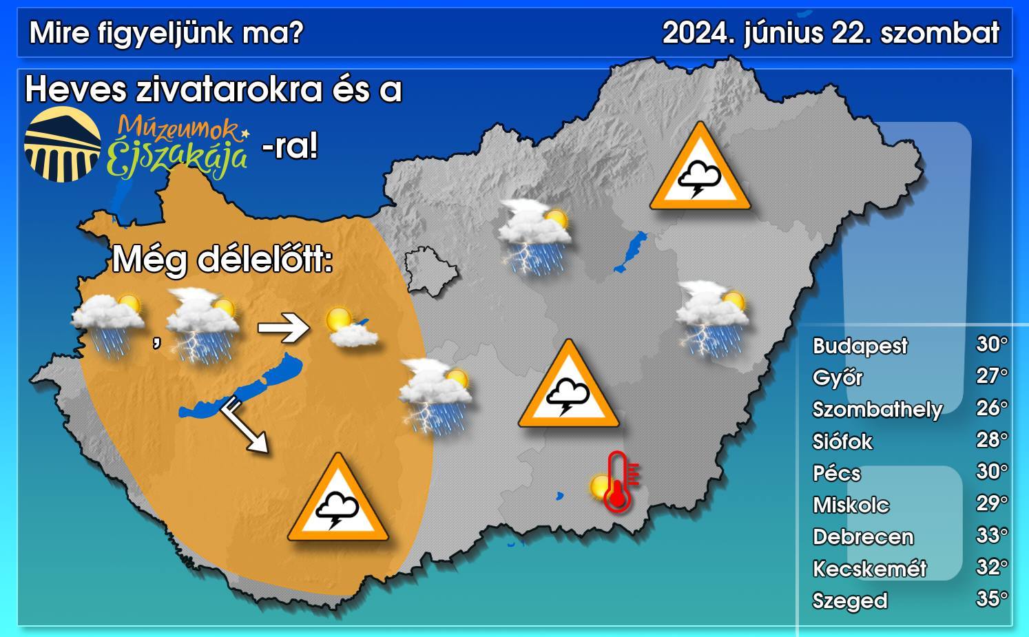 Az éjszaka érkező hidegfront hatására a délelőtti órákban főleg a Dunántúlon és az ország középső részén előfordulhat zápor, zivatar, de délutánra fokozatosan csökken a csapadékhajlam. Ugyanakkor nagy területen feltámad az északnyugati szél, mely hűvösebb levegőt hoz, így ott már ma mérséklődik a kánikula. A csapadéktevékenység délután egyre inkább az ország délkeleti, keleti felére összpontosul, nagy eséllyel ott alakulhatnak ki záporok, zivatarok, sőt heves zivatarok is felhőszakadással, nagy méretű jégesővel, erősen viharos széllökésekkel. Már most másodfokú figyelmeztető előrejelzés van kiadva az ország nagy részére heves zivatarokra. Továbbá hazánk délkeleti tájain még ma is tovább tombol a kánikula, arrafelé még 35 fok közelében alakulhat a csúcsérték – közölték a HungaroMet NZrt. posztjában.