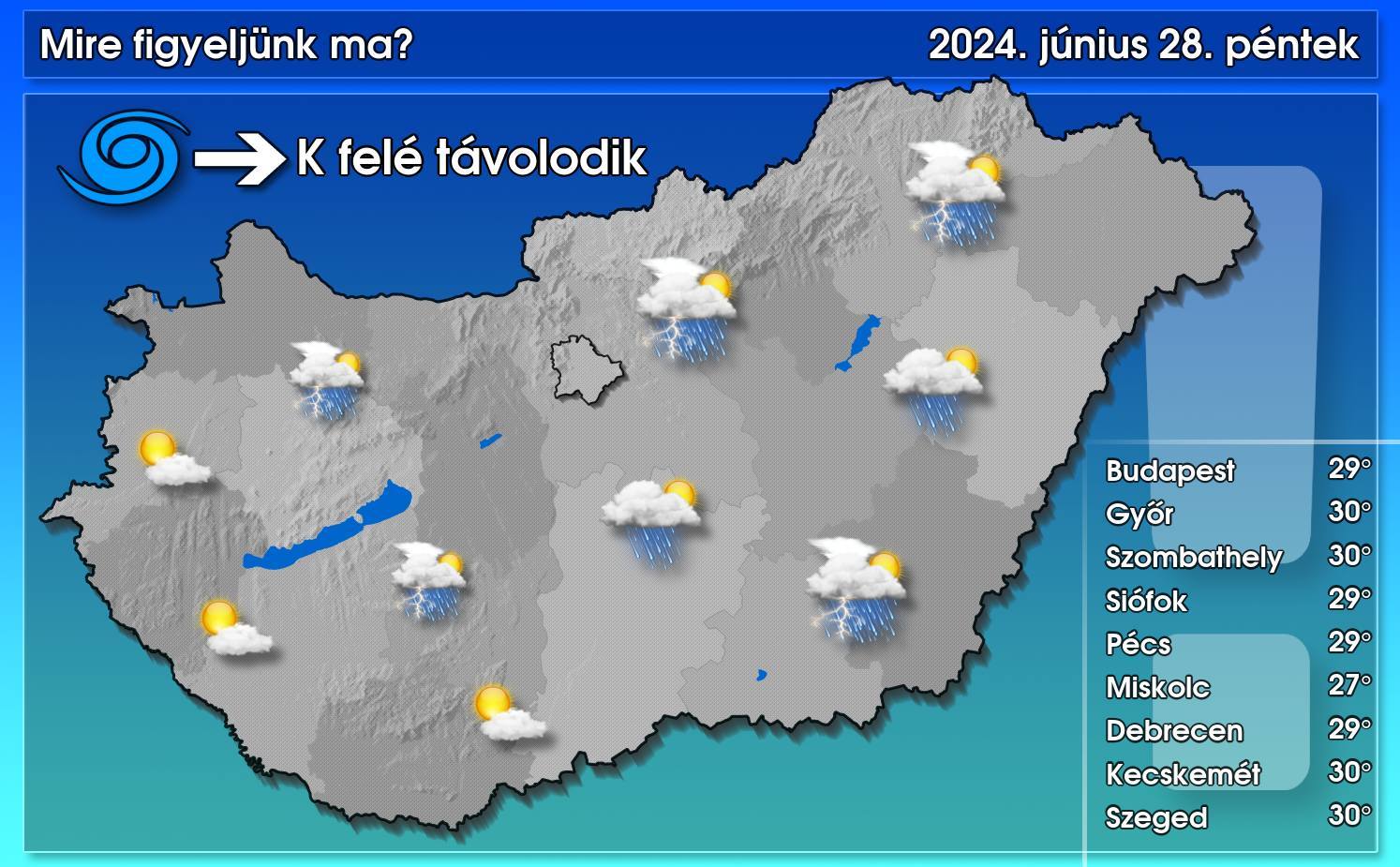 A hidegcsepp, mely labilizálta a légkört, egyre inkább kelet felé halad, gyengül is, így nagyobb számban a Dunától keletre alakulhatnak ki záporok, elsősorban felhőszakadással kísért zivatarok. Az intenzívebb cellákat még kisebb méretű jégeső és erős széllökés is kísértheti. Ugyanakkor a Dunántúlon is kipattanhatnak még helyenként – Nyugat-, Délnyugat-Dunántúlon a legkisebb számban – csapadékgócok. Marad a fülledt, meleg idő, a csúcsérték általában 27 és 32 fok között várható – közölték a HungaroMet NZrt. posztjában.