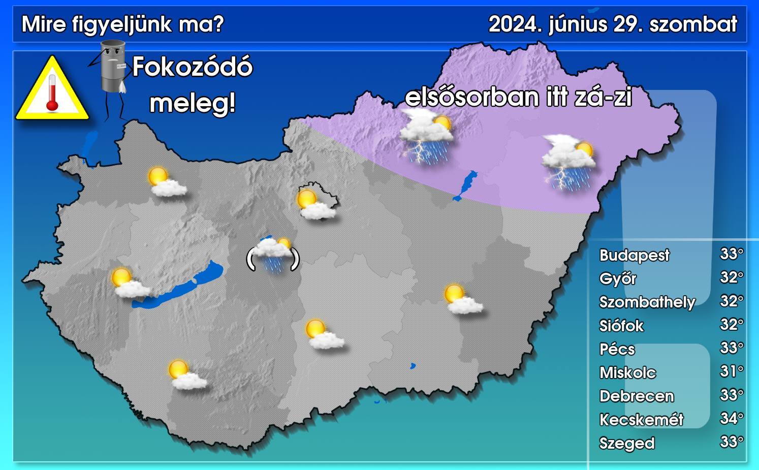 Strandoláshoz ideális lesz ma az idő, azonban figyeljünk a nagyon erős UV-sugárzásra, óvjuk bőrünket a káros ultraibolya sugarak ellen. Lehetőség szerint 11 és 15 óra között ne tartózkodjunk a tűző napon Mára már elsőfokú figyelmeztetés van érvényben néhány északkeleti megye kivételével magas középhőmérsékletre vonatkozóan, a csúcsérték 30 és 34 fok között alakul délután. Ma jóval szárazabb idő ígérkezik, sokat fog sütni a nap, főként az északkeleti harmadban törhetnek magasabbra a gomolyfelhők, melyekből helyenként kialakulhat zápor, zivatar, azonban egy-egy csapadékgóc máshol sem kizárt.