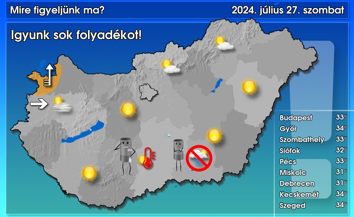 Most még elviselhető, sőt talán kellemesnek mondható az idő, ám gyorsan emelkedik a hőmérséklet, délutánra egészen 30, 35 fokig. Felhők sem fognak nagyon adni árnyékot (pláne nem csapadékot), inkább a hegyek környezetében képződhetnek gomolyok, illetve délután nyugat felől sodródhatnak be fátyolfelhők. A délies szél az Észak-Dunántúlon megélénkül, Sopron térségében meg is erősödik.