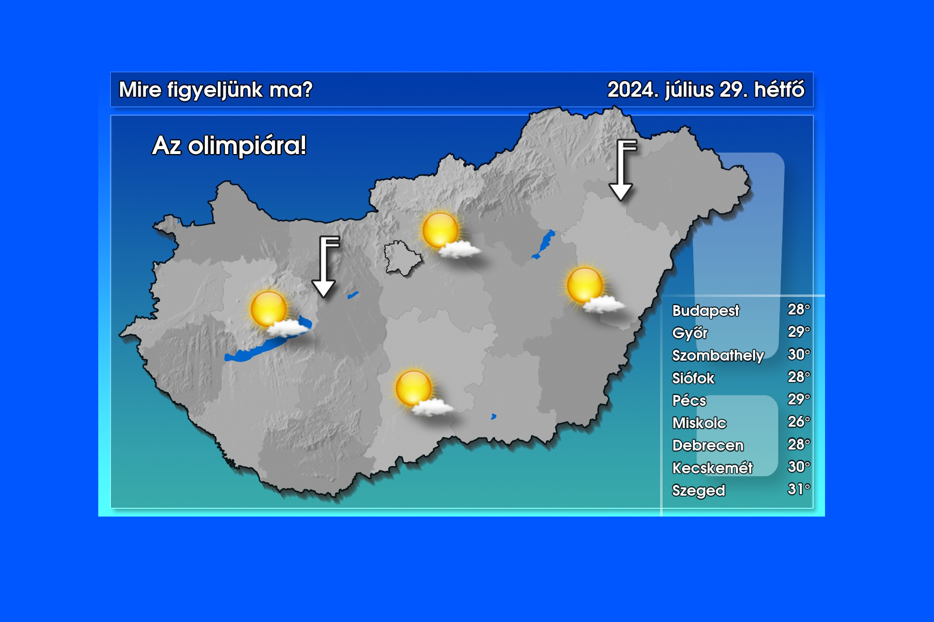 Jó reggelt! Az időjárás felől ma nyugodtan lehet olimpiát nézni, derült, napos, csapadékmentes idő valószínű, legfeljebb kevés felhő lehet az égen. Az északnyugati, északi szél többfelé megélénkül, de erős széllökések legfeljebb néhol lehetnek. A csúcshőmérséklet 26 és 31 fok között alakul, tegnaphoz képest tehát érdemben visszaesett a hőmérséklet, de holnaptól ismét melegedés kezdődik – írta közösségi oldalán a HungaroMet.