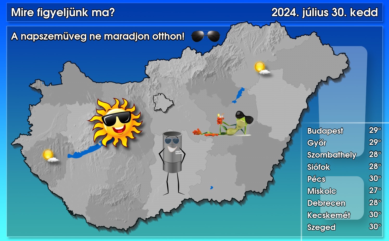 Nagy dolgok nem fognak történni ma a légkörben. Szikrázó napsütés várható néhol kevés gomolyfelhővel, csapadék nélkül. A légmozgás csak helyenként élénkülhet meg. A csúcsérték döntően 26 és 31 fok között alakul. A napszemüveg ne maradjon otthon, másra nem nagyon kell figyelni.
