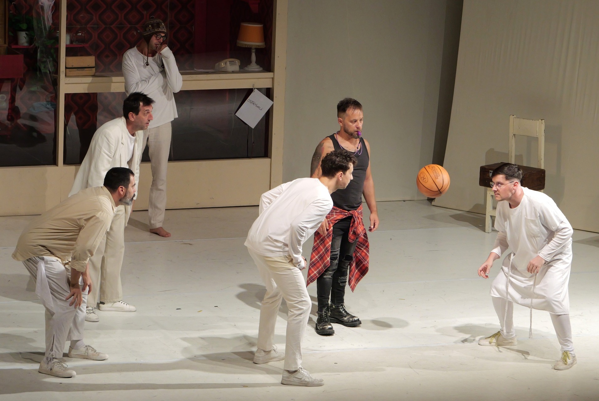 A betegek manipulációjának helyszíne egy patyolatfehér kórterem, amelynek jobboldali falára időnként rávetül a bejárati ajtó feletti ventilátor horogkereszt-formájú árnyéka (látvány: Romulus Boicu). A szakalkalmazott „vallatók” irodája a közönséggel szemben helyezkedik el, egy üveg mögötti portaszerű „kalitkában”. Innen irányítják katonás tempóban a férfi kezelteket az egyenruhás nők.