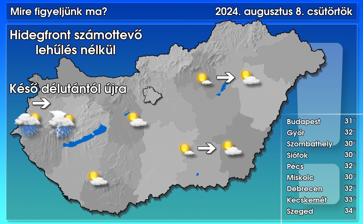 Gyengülő hidegfront halad kelet felé, amely számottevő lehűlést nem eredményez, az ország nagyobb részén még melegebb is lesz délután, mint tegnap volt. Az első, jelenleg a Nyugat-Dunántúlon levő többé-kevésbé összefüggő csapadékzóna kelet felé halad, de közben gyengül, egyre inkább szétesik, dél, délkelet felé haladva csökken a csapadék esélye. A második csapadékzóna késő délutántól érkezik nyugat, északnyugat felől, ebből elsősorban a Dunántúlon lehet zápor, zivatar. A csapadékzónák környékén átmenetileg felhős lesz az ég, előttük és utána viszont több órára kisüt a nap. Az északnyugati szelet élénk, a front mentén átmenetileg erős lökések kísérhetik.