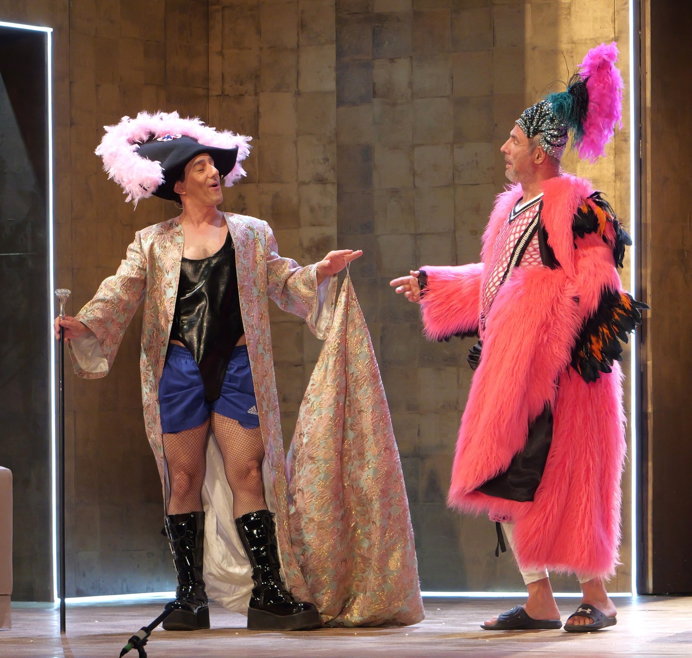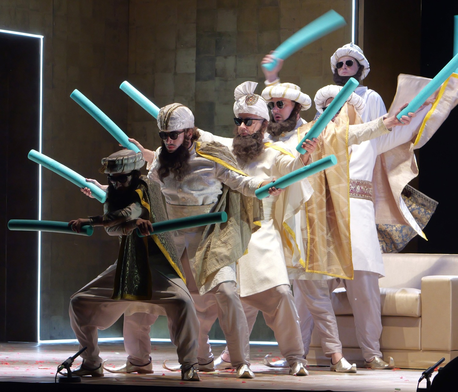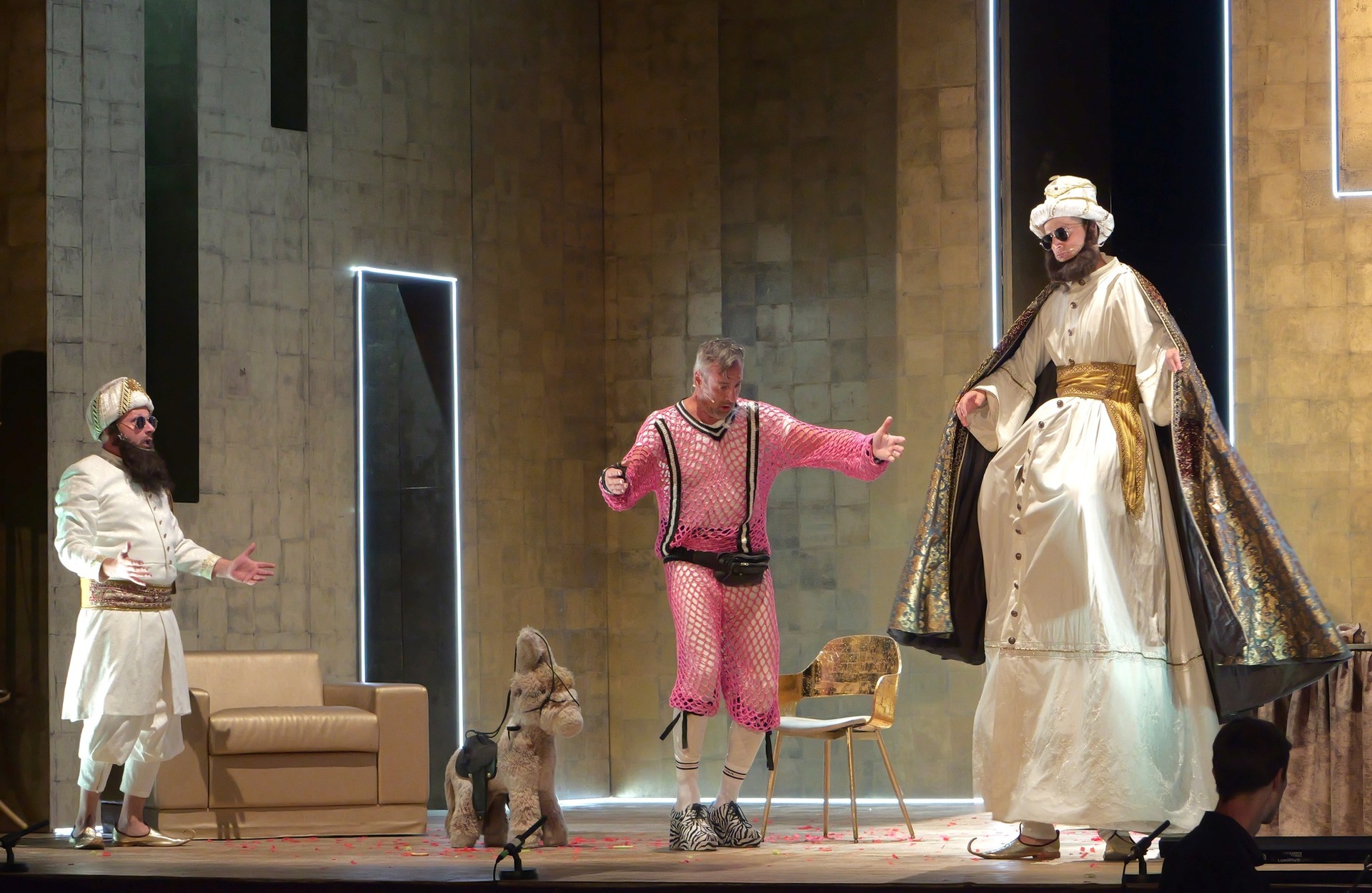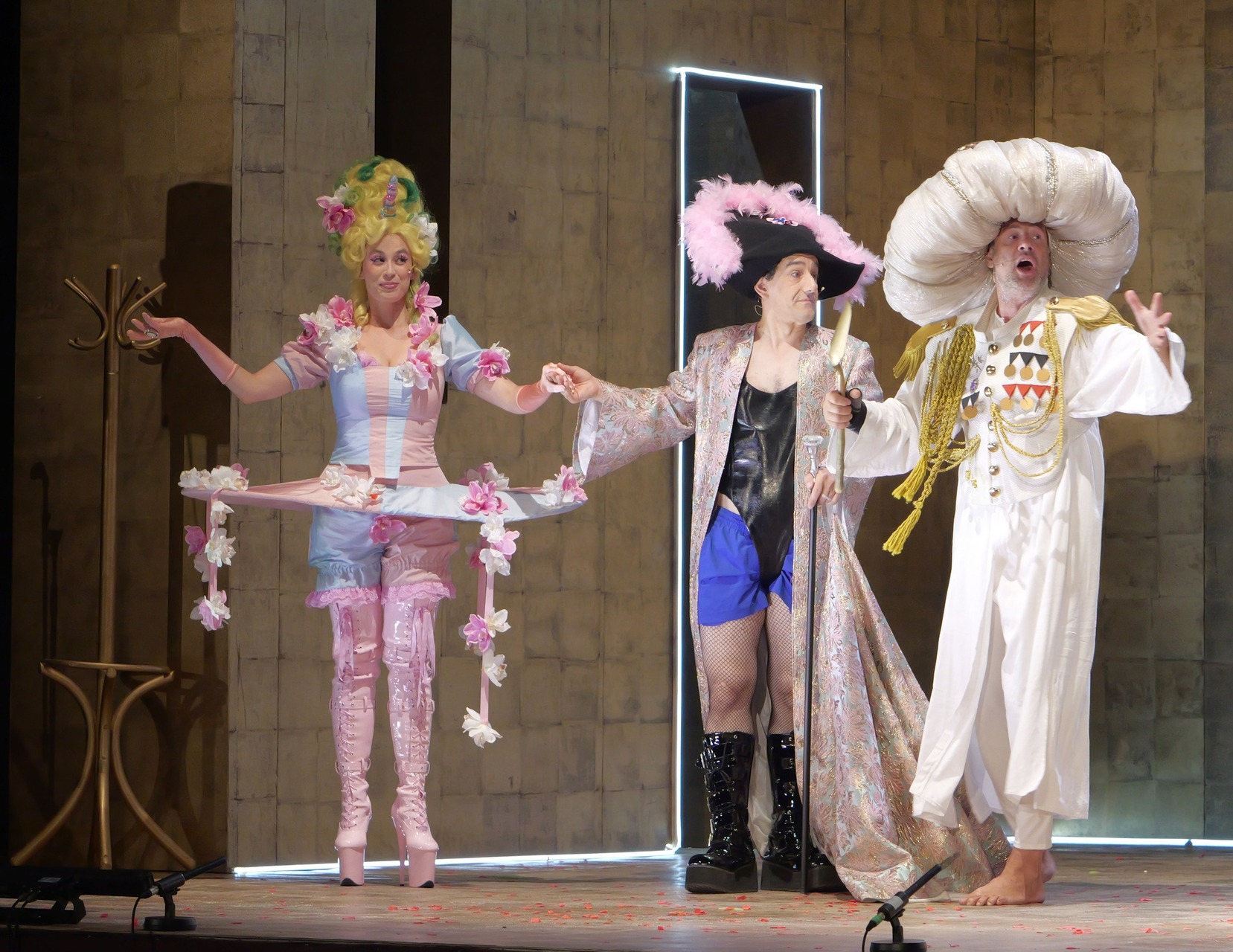 Bianca Imelda Jeremias jelmezei a rokokó divatot, napjaink giccsét és az LMBTQ-csoportok divattörekvéseit elegyítették gunyoros módon, a törökök napszemüvegeikkel azonban inkább arab üzletemberekre hajaztak, mintsem valódi önmagukra, ám együttesük feldobta a darab hangulatát. Amiként a filozófus és a japán küzdőmester figurája is.