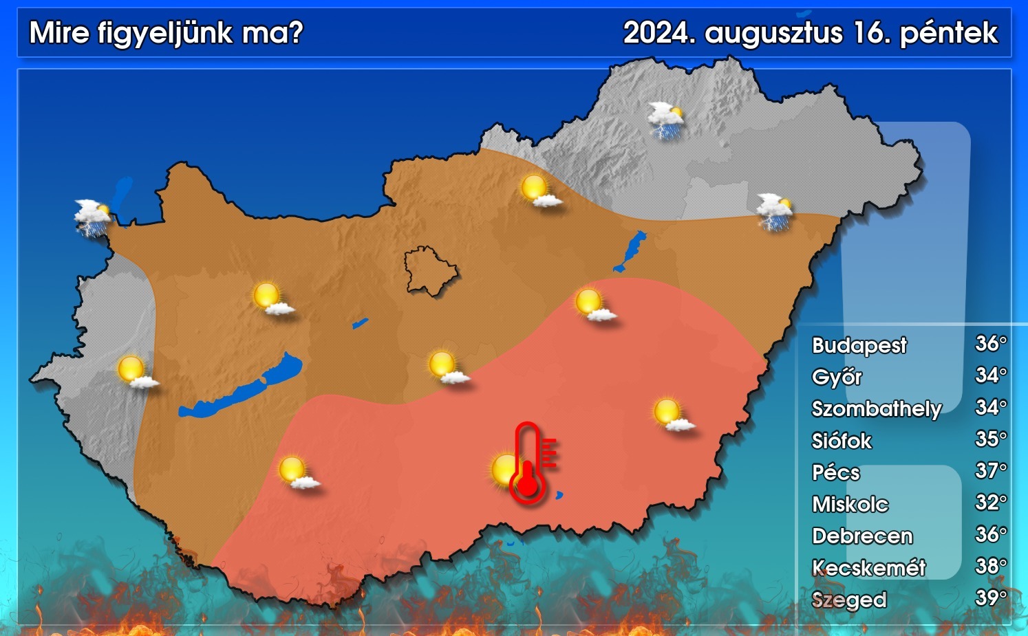 Újabb hőségnap, továbbra is az Alföldön élők számíthatnak a legmagasabb maximumokra. A fátyolfelhőzet és kevés gomolyfelhő mellett sok napsütés várható, zápor, zivatar csak néhol, nagyobb eséllyel Sopron térségében és az északkeleti tájakon alakulhat ki. Az északnyugati szél legfeljebb néhol lengedezhet, de a zivatarokat erős, esetleg viharos széllökés is kísérheti.