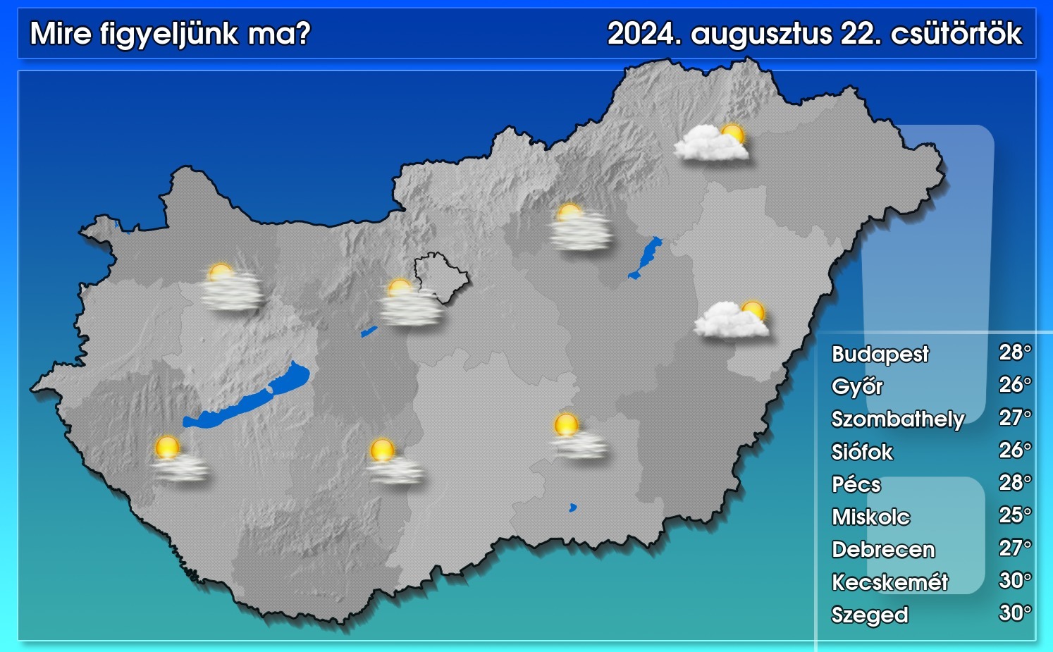 Mára már megnyugszik az időjárás, a fátyolfelhőzet az északi tájakon szűrheti jobban a napsütést, néhol gomolyfelhők is képződhetnek. Csapadék nem valószínű. Az északkeleti szél a keleti megyékben délutánig még megélénkül. A csúcshőmérséklet 25 és 31 fok között alakul.