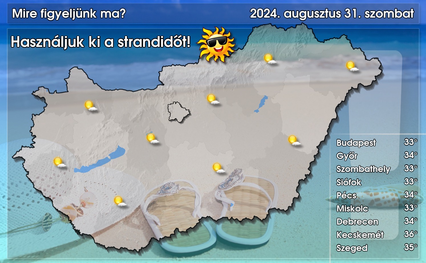 A mai nappal megkezdődött a nyári szünet utolsó hétvégéje. Az időjárás továbbra is a strandolni vágyóknak kedvez: kánikula elé nézünk sok napsütéssel, zápor, esetleg zivatar legfeljebb egy-két helyen fordulhat elő – közölte a HungaroMet NZrt.