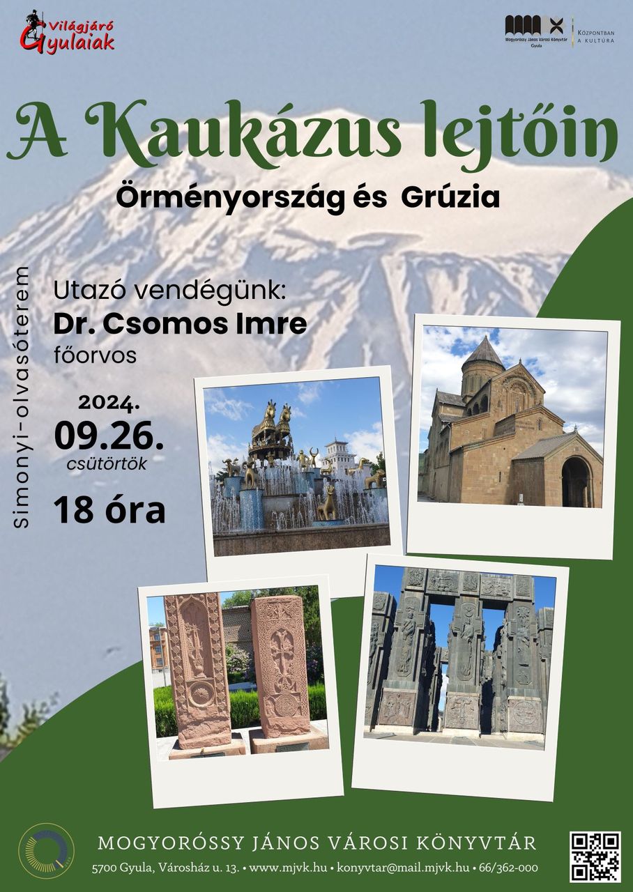 Csomos Imre ezúttal a Kaukázus vidékéről, Örményországról és Grúziáról szerzett élményeit mutatja be vetített képes előadás formájában szeptember 26-án, csütörtökön 18 órától a városi könyvtár Simonyi olvasótermében.