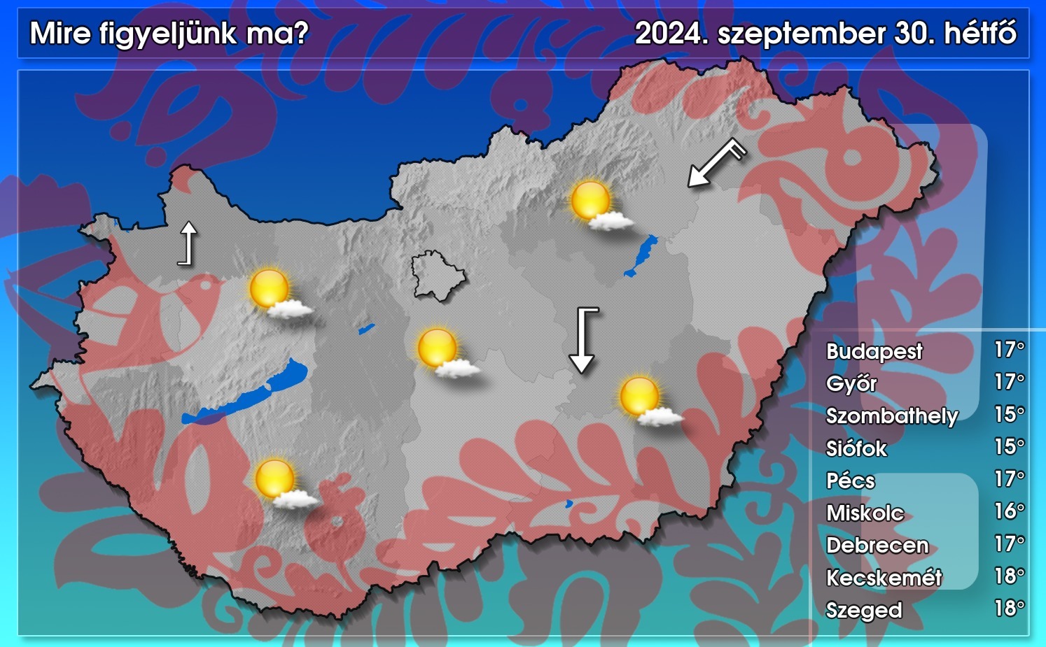 Ma a felhős részeken is szakadozik a felhőzet, délután – helyenként jobban szétterülő – gomolyfelhők zavarhatják a napsütést, csapadék nem várható. Elsősorban a Tiszántúlon élénk marad az északi szél, sőt néhol időnként erős széllökés sem kizárt, ugyanakkor az ország többi részén többnyire mérsékelt lesz a légmozgás. Emellett az Észak-Dunántúlon már délire fordul az áramlás. A csúcshőmérséklet 14 és 19 fok között valószínű. Késő estére 6 és 12 fok közé hűl le a levegő – közölte a HungaroMet NZrt.