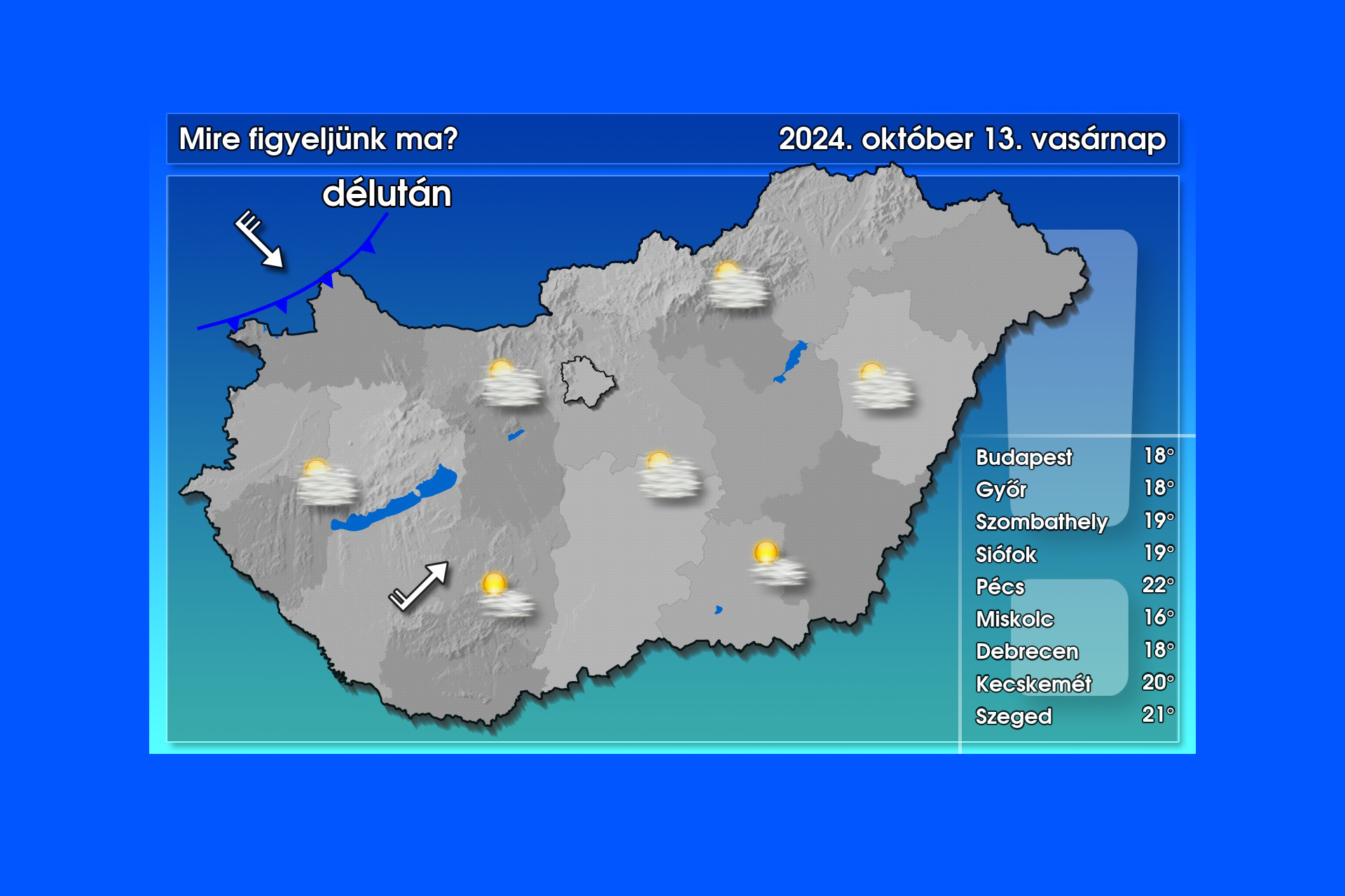 Ugyan ma már több felhő lesz felettünk, amelyek szűrhetik a napsütést, de csapadéknak kicsi az esélye, emellett a hőmérséklet is 15 és 22 fok között várható, így érdemes lesz kimozdulni. Kezdetben a délnyugati szél lengedezhet, majd délután északnyugat felől egy súroló hidegfront hatására – főként az Észak-Dunántúlon – meg is erősödik az északnyugatira forduló szél – írta közösségi oldalán a HungaroMet.