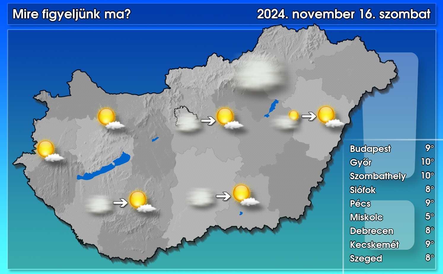 A ködös részeken csak lassan javulnak a látási viszonyok, majd főként a Dunántúlon és a Tiszántúl egy részén több órára kisüt a nap, Azonban az Északi-középhegység térségében és a Duna-Tisza köze egyes részein tartósan párás, ködös maradhat az idő. A déliesre forduló szél az Észak-Dunántúlon megélénkül, Sopron környékén erős lökések is lehetnek. Délután a napos tájakon általában 8, 12 fokot mérhetünk, azonban a borult, párás részeken ennél több fokkal hidegebb maradhat az idő.