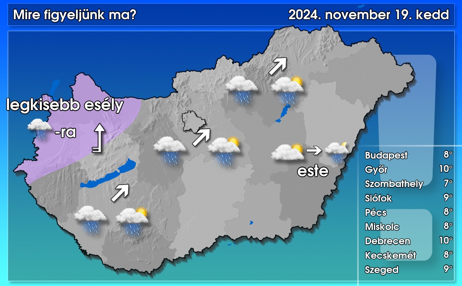 Ma melegebb és nedvesebb léghullámok érkeznek térségünkbe, emiatt felhős és az ország egyes részen csapadékos időre számíthatunk. Kezdetben még csak a déli, délnyugati tájakon valószínű eső, zápor, majd délutánra a csapadékzóna fokozatosan halad északkelet felé, miközben nyugat felől lassan vékonyodik, szakadozgat a felhőzet. Rövidebb napos periódusokra a keleti, délkeleti tájakon, majd délután a nyugati megyékben van kilátás. A déli szél időnként megélénkül. A csúcsérték 5 és 12 fok között valószínű, a tartósabban borult, csapadékos részeken lesz a hűvösebb, délkeleten enyhébb az idő.