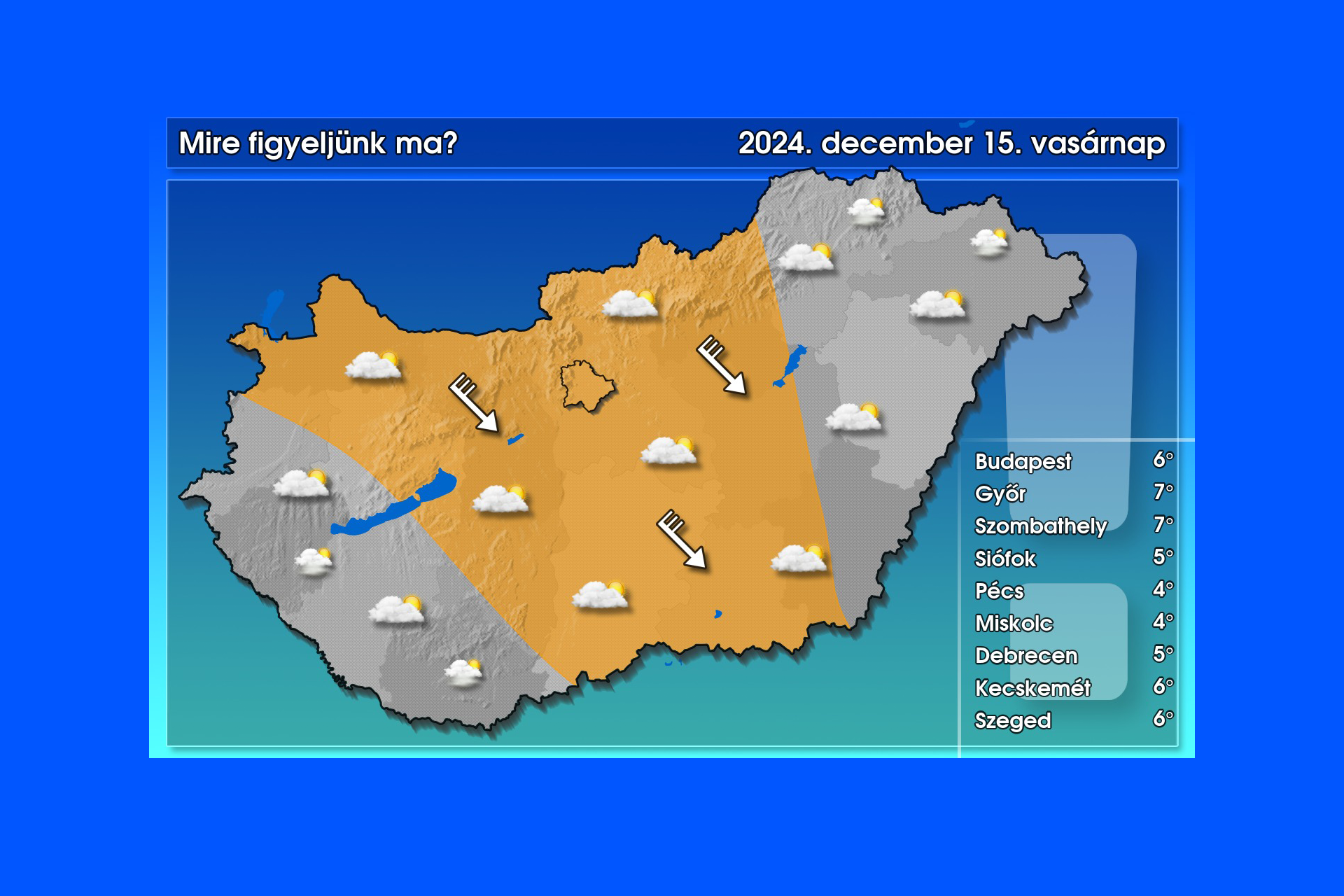 Úgynevezett álcázott hidegfront érte el térségünket éjszaka, amely mögött bár a magasban hidegebb levegő áramlik, a talaj közelében mégis enyhülést okoz, ugyanis a front mögött egyre nagyobb területen feltámadó és megélénkülő, megerősödő északnyugati szél jócskán „átkeveri” az alsó légréteget, ezzel pedig kisöpri az itt megülepedett hideg légtömeget. Szeles időre leginkább a narancssárgával jelölt területen lehet számítani. Jobbára közepesen vagy erősen felhős lesz az ég (a legtöbb felhő északkeleten és délnyugaton ígérkezik), de csak elvétve lehet futó zápor, hózápor. A csúcsérték jellemzően 4 és 8 fok között várható, de a szélárnyékosabb délnyugati és északkeleti vidékeken kissé alacsonyabb is lehet – írta közösségi oldalán a HungaroMet.