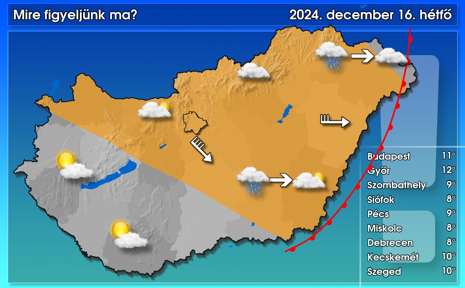Melegfront felhőzete érkezett, ebből délelőtt még lehet kisebb eső a keleti, északkeleti tájakon. Délutánra megszűnik a csapadék, és a felhőzet is csökken, a legtöbb helyen kisüt a nap. Az északnyugati, nyugati szél többfelé megerősödik, néhol viharossá fokozódik. A magasban érkező meleg légtömeg és a szeles idő együttesen a sokévi átlagnál több fokkal melegebb időt eredményez. A legtovább borult északkeleti, keleti tájakon hűvösebb marad az idő, a legtöbb helyen viszont 8, 13 fok lesz a jellemző.